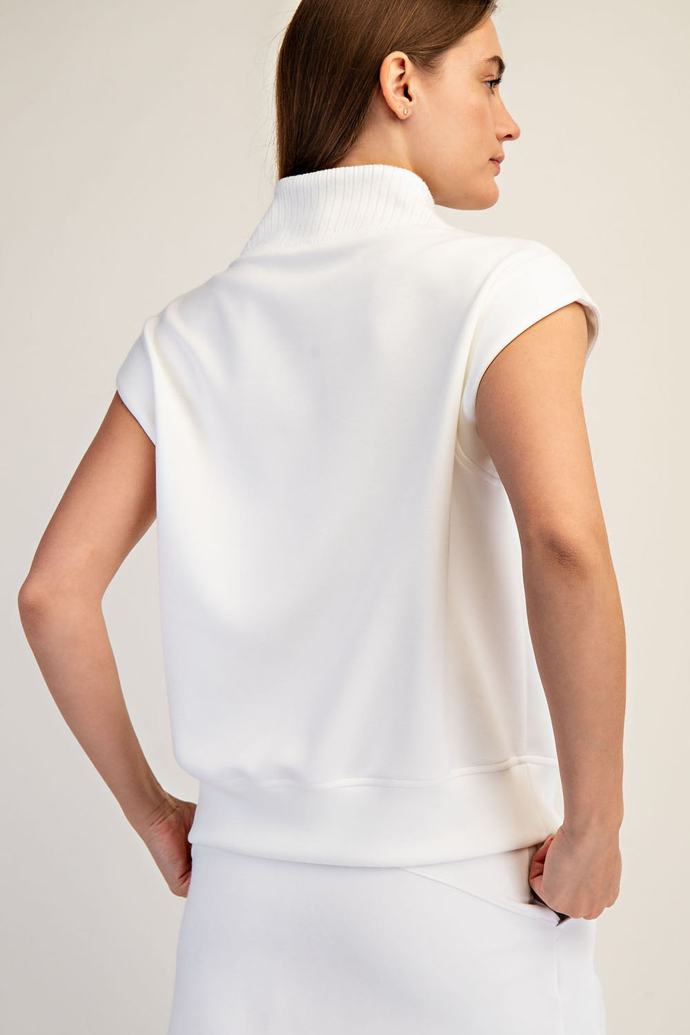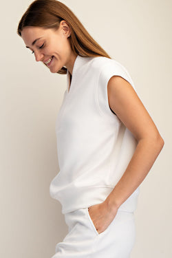 This cream modal sleeveless top combines understated elegance with modern versatility. Crafted from sumptuous soft fabric, it features a quarter zip closure and refined 4x2 ribbed detailing for subtle texture.