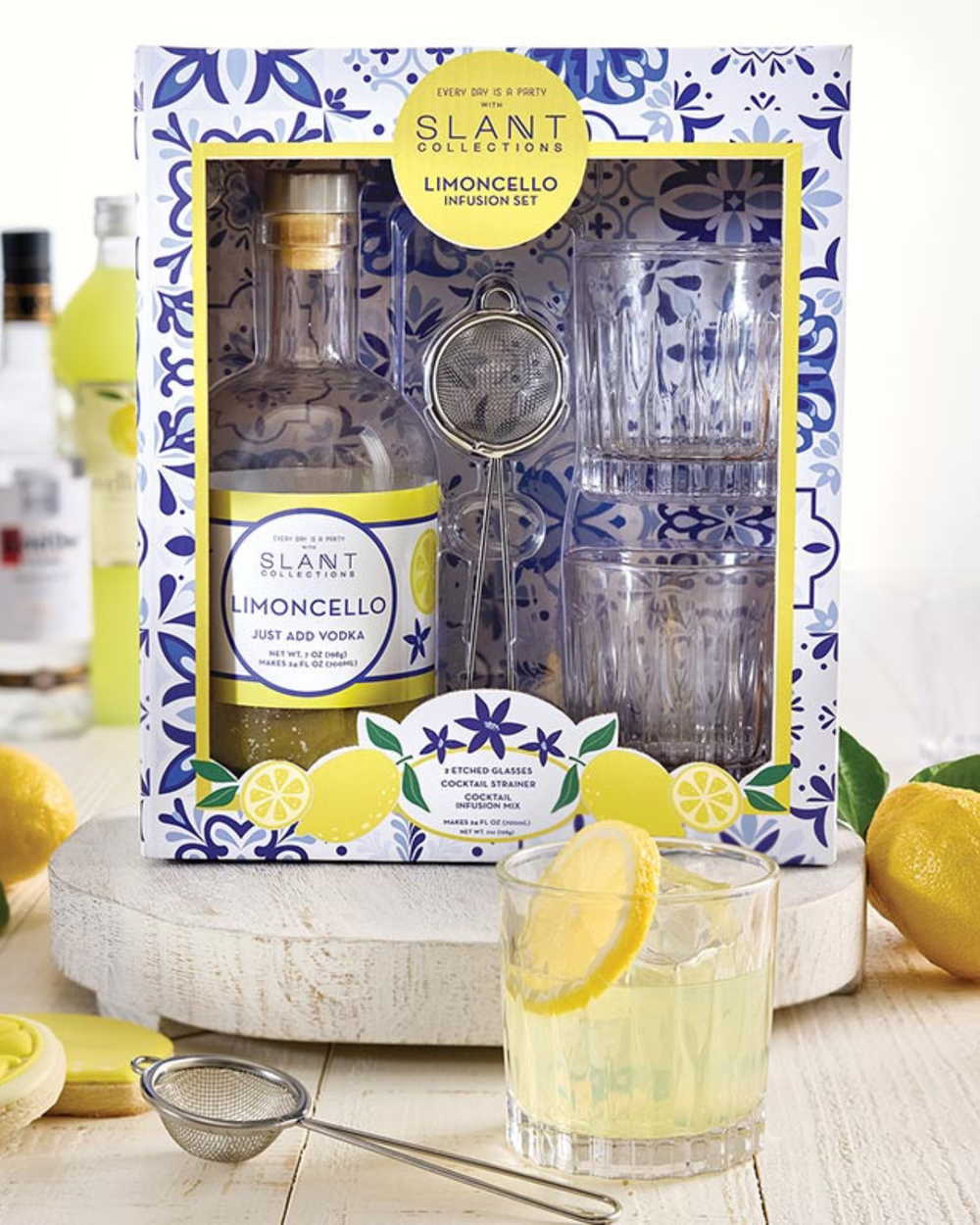 Mix vodka with our infusion bottle, wait 12 hours, and boom—homemade limoncello! Includes two gorgeous faceted glasses and a stainless-steel strainer. Pure citrus joy in a box.