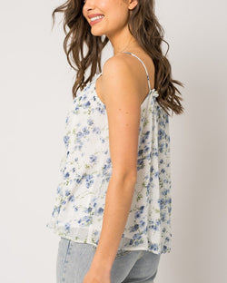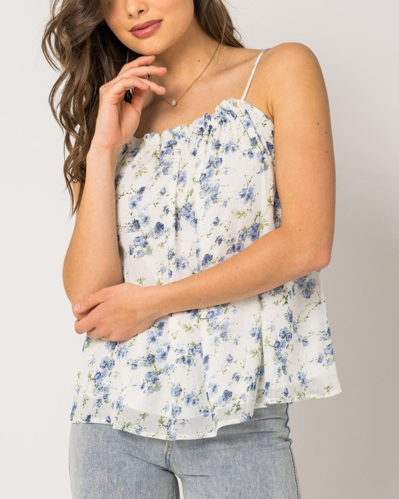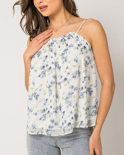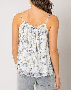 This playful and flirty Pleated Cami Floral Top in White/Blue Floral is a must-have addition to your wardrobe. Its pleated design adds texture and dimension, while the delicate floral print brings a touch of whimsy. Perfect for any occasion, this top is sure to turn heads and make you feel confident and chic.