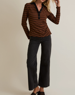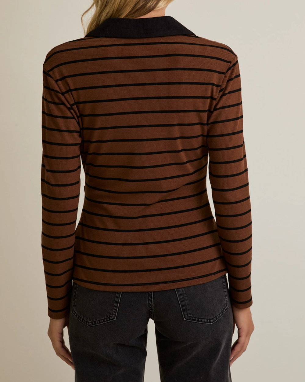 This brown and black striped long sleeve top features playful button details that add a charming twist to your everyday look. Cozy and stylish, it’s perfect for layering or wearing solo with your favorite jeans.