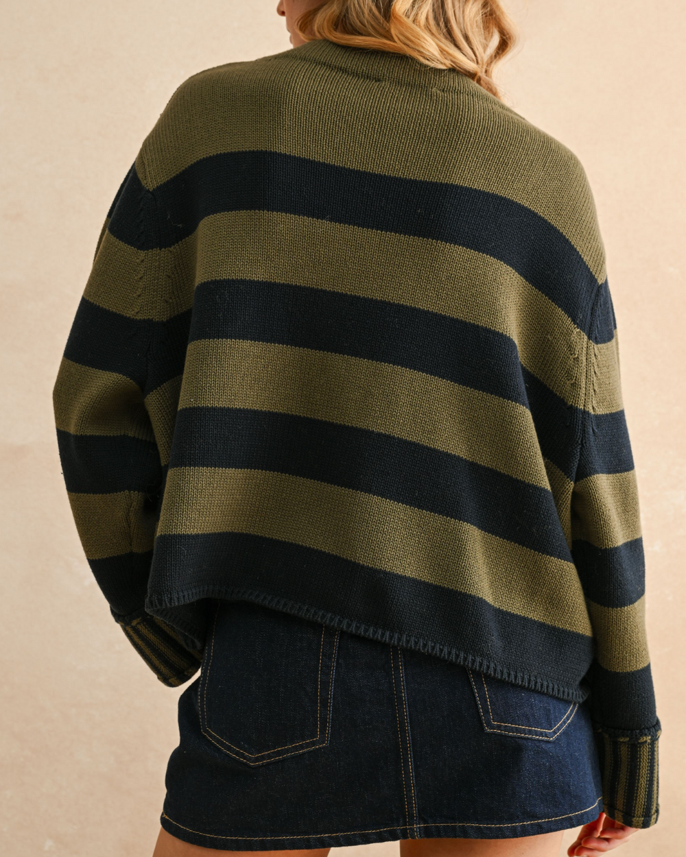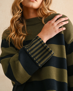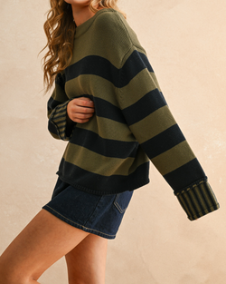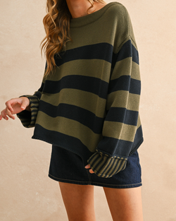 Cozy up in the Striped Sweater Top with fun navy and olive stripes that brighten any day. Soft, stylish, and ready to play.