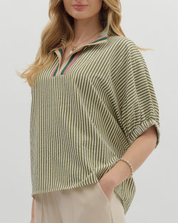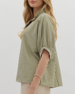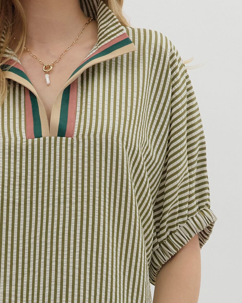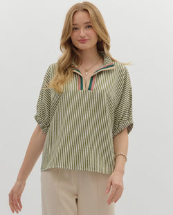 This darling stripe pattern top features a high neck, elasticated sleeve bands and accented multicolor rib band at the split neckline. Easy to style and comfy to wear.