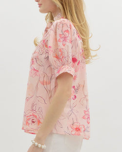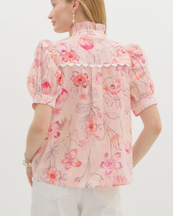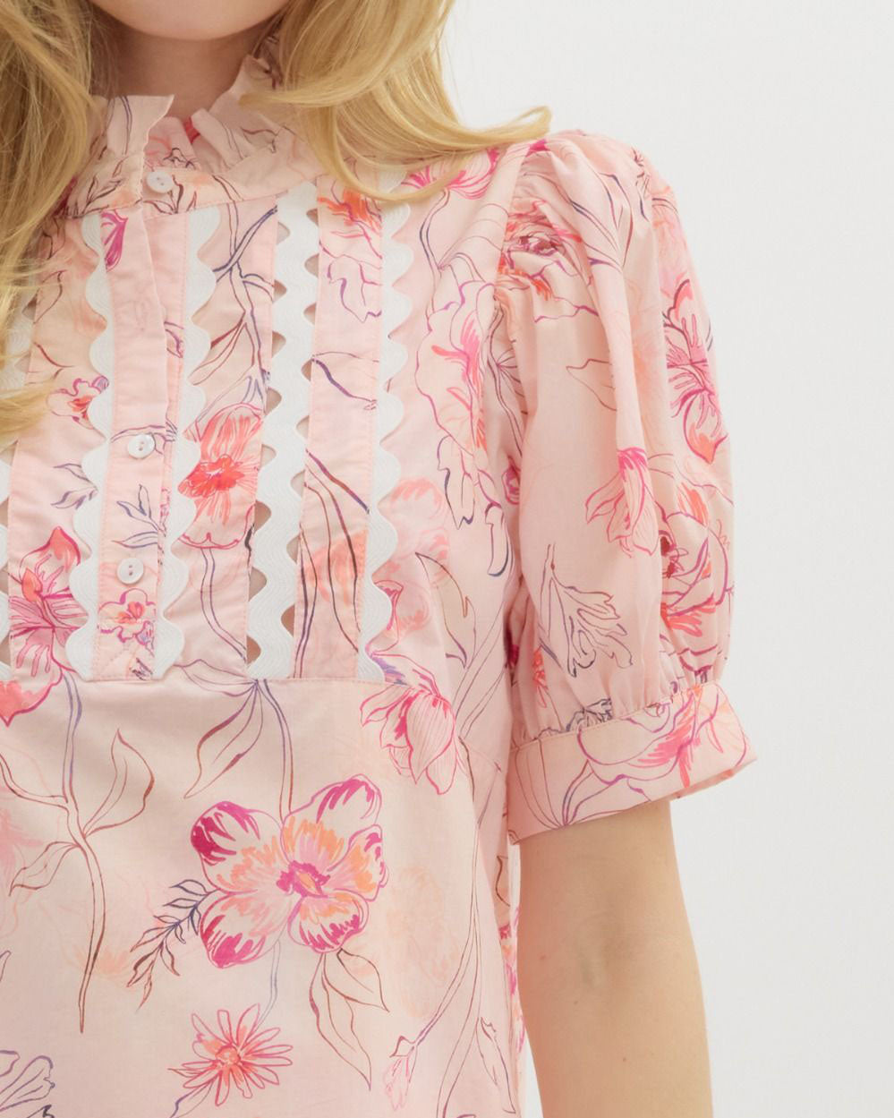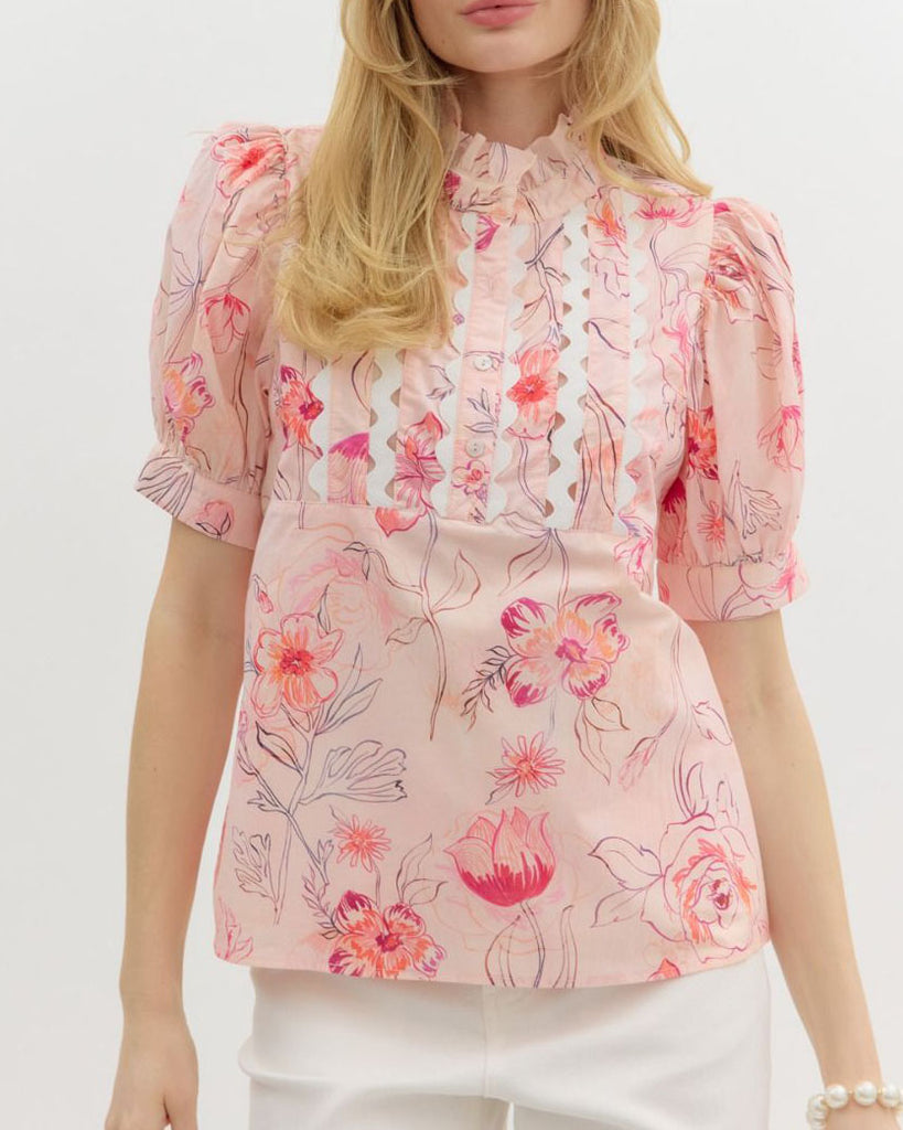 This floral print pullover top features a cuff band short sleeve, ruffle accented high neck and ricrac trim inset. The perfect summer print and shade to style for work or play.
