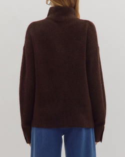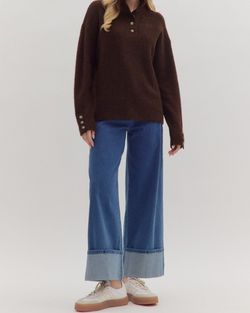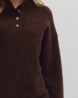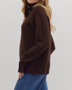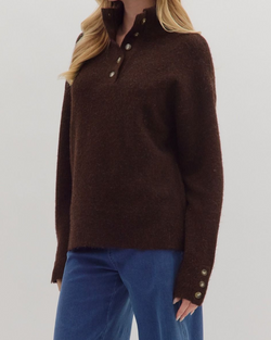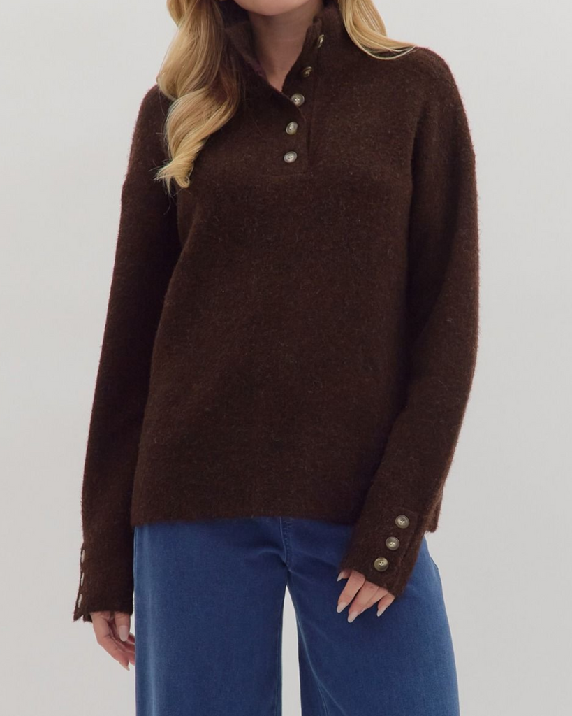 Wrap yourself in cozy charm with this solid chocolate sweater, featuring a high neck and playful button details down the placket and cuffs. It’s the perfect blend of snug and stylish for those charming chilly days.
