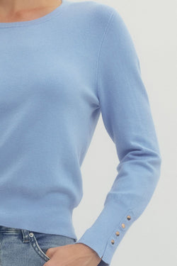 Cozy knit top with a fun twist—adorable button details at the cuffs add personality to your everyday look. Perfect for layering or wearing solo, this piece brings effortless charm to any outfit.