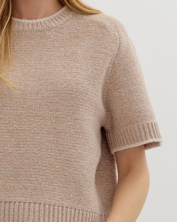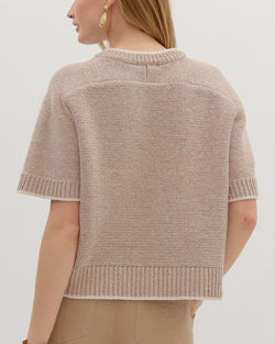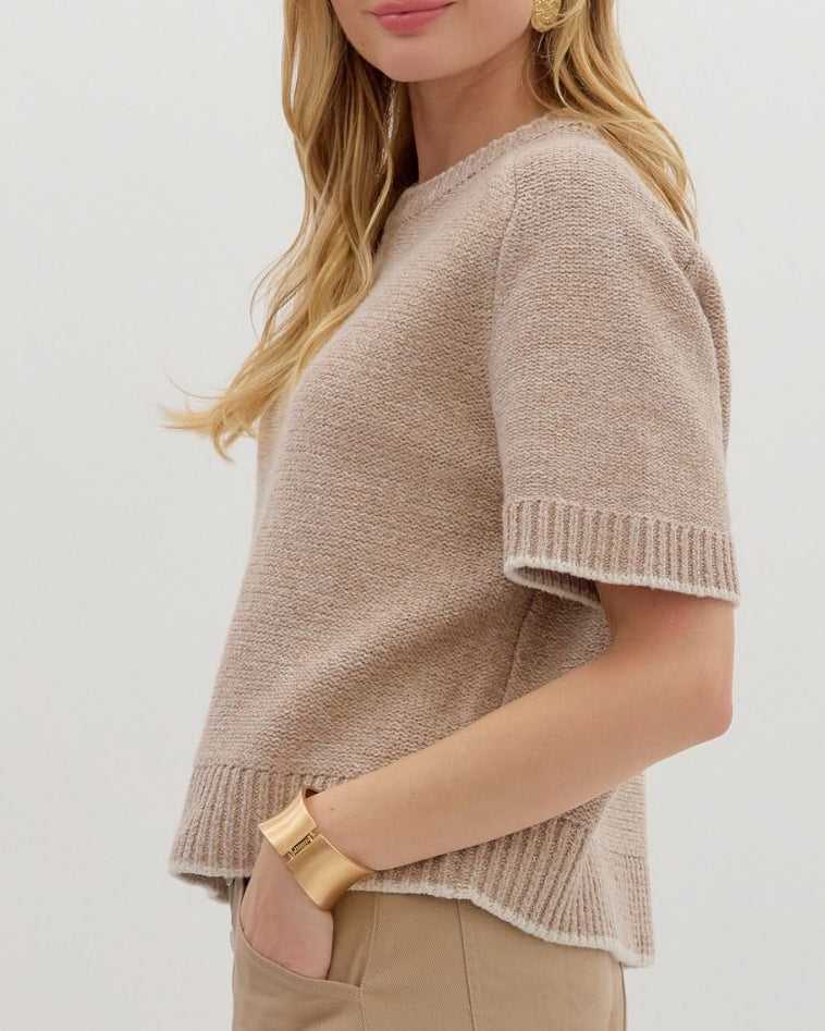 This soft knit sweater top features elbow-length sleeves and contrast accent edge detail. A wardrobe staple for work or casual days.