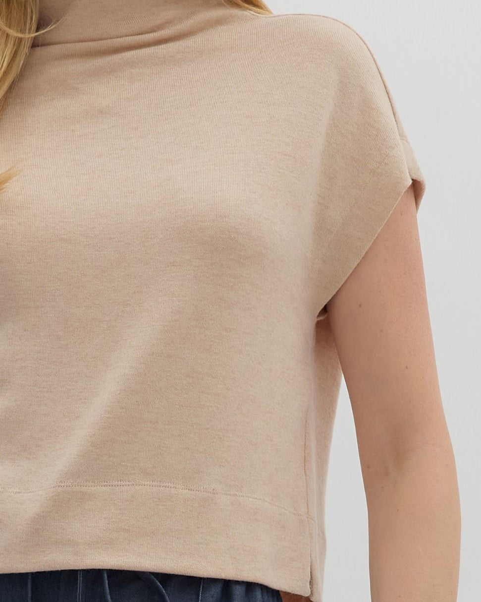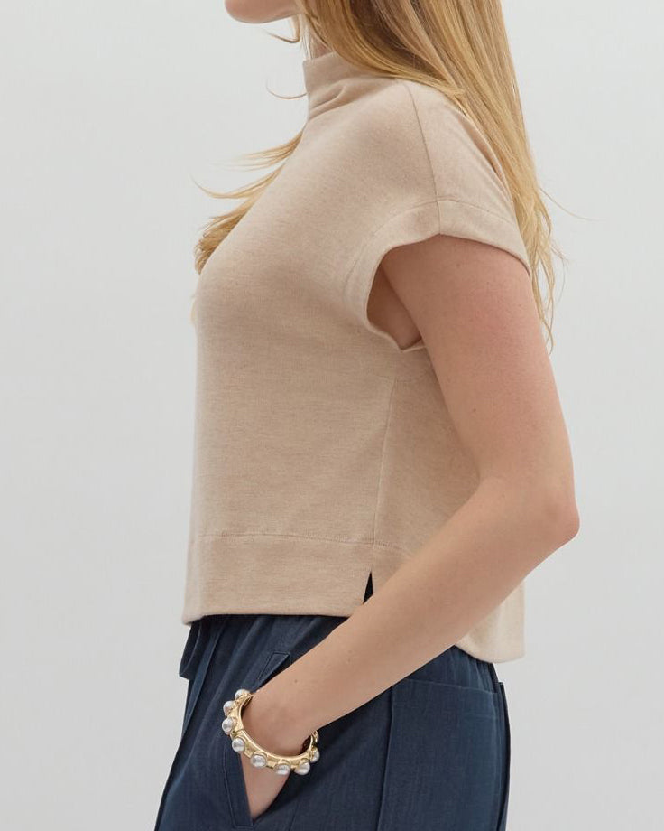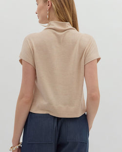 This soft, knit top features a mock neckline and short sleeves. A pullover style that can be worn with everything from jeans to skirts to trousers. A wardrobe staple.