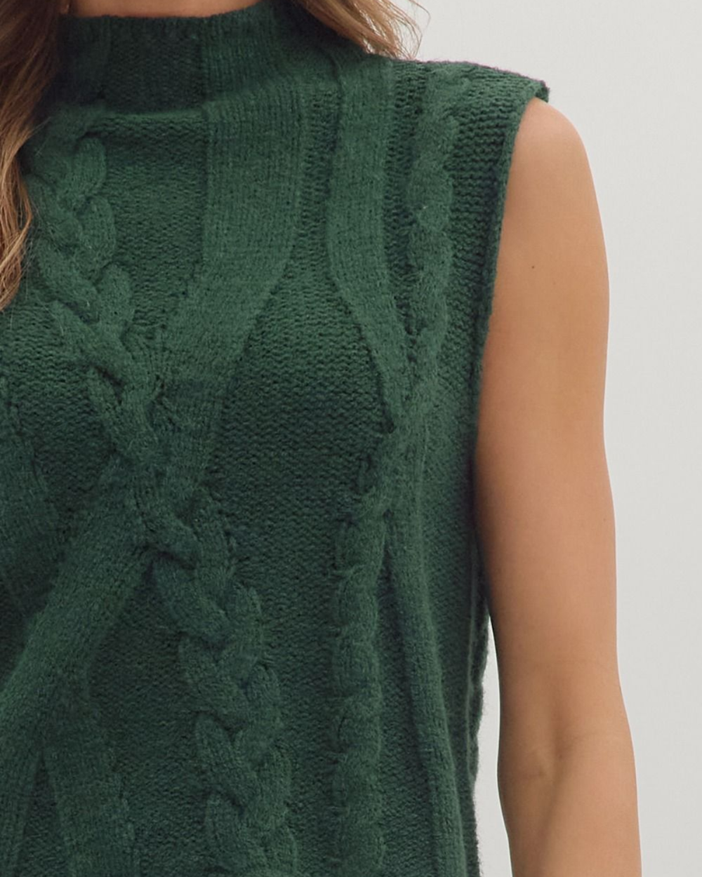 This sleeveless sweater top in rich forest green offers a chic twist with its cozy cable knit texture and stylish mock neck. Perfect for layering or wearing alone, it adds a dash of playful sophistication to any outfit.