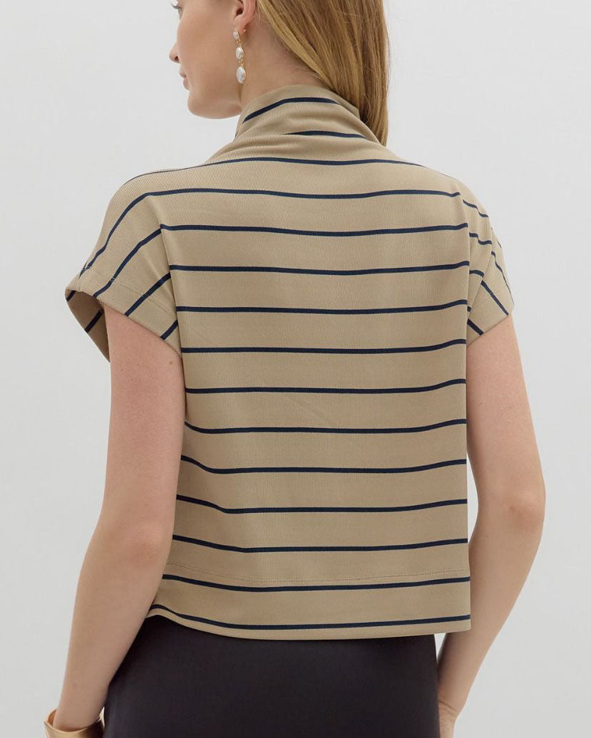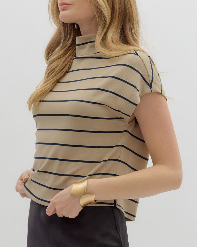 This soft top features a chic stripe pattern, a mock neckline and a jersey knit fabrication. A pullover style that is easy to style and versatile.