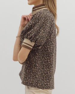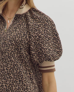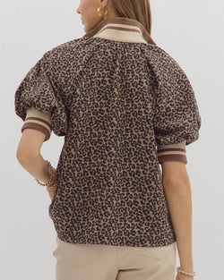 This leopard pattern top features short puff sleeves, a half-zip detail at the front and multicolor band collar and sleeves. An elevated casual top that is on trend and chic.