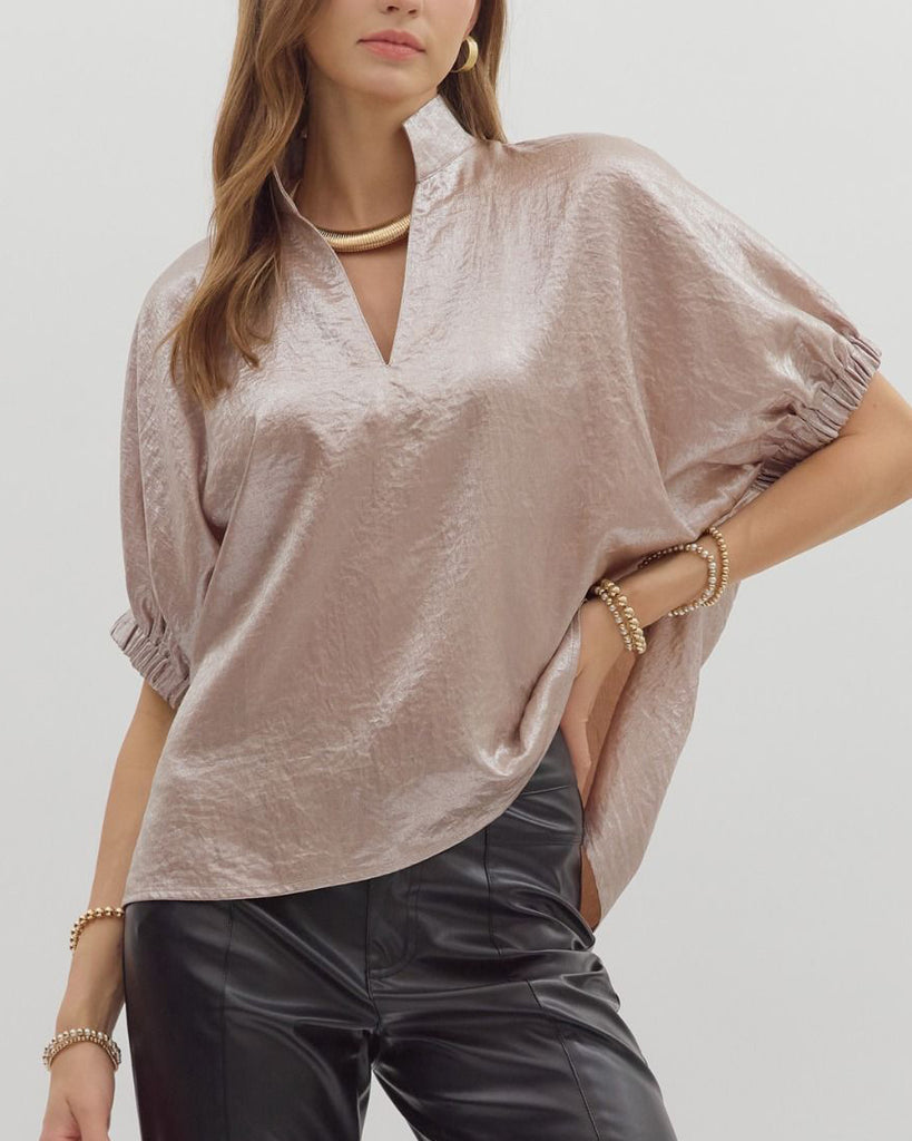 Elevate your wardrobe with this metallic V-neck top in champagne. Featuring a refined band collar and short dolman sleeves, its subtle shimmer and sleek silhouette offer understated elegance perfect for both daytime sophistication and evening allure.