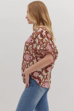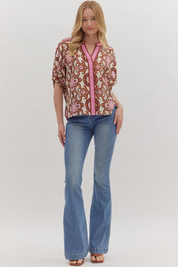 Step into fall with this chic blouse, designed to bring a fresh touch to your wardrobe. Its elegant abstract print and contrast trim V-neck create a striking look, while the elasticated sleeve openings ensure a perfect, comfortable fit all day long. This blouse effortlessly combines style and ease, making it an essential piece you'll reach for again and again.
