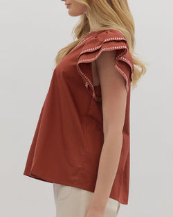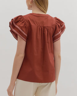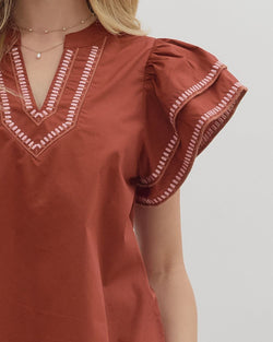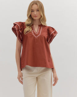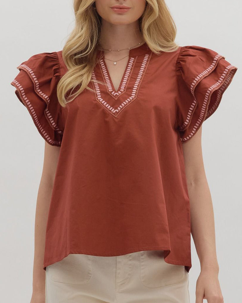 This solid brick-colored top features layered ruffle flutter sleeves and a flattering V-neckline highlighted by a contrast embroidered trim. Crafted for both style and comfort, it effortlessly elevates your look with delicate detailing and a feminine silhouette perfect for versatile, polished outfits.