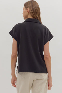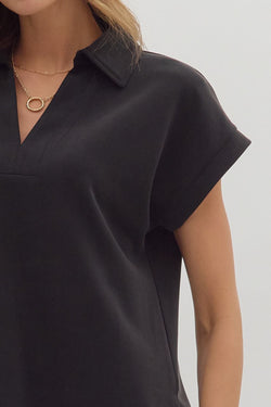 This black cuffed short sleeve top offers a refined silhouette with a collared V-neck and subtle side slit detail, combining classic structure with modern ease. Perfect for elevating both office and casual looks, it provides effortless sophistication and comfort throughout your day.