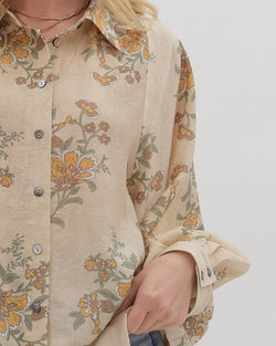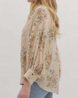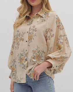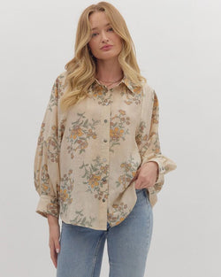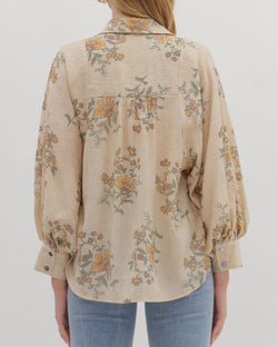 This elegant long sleeve top showcases a delicate floral print and is crafted with soft pleating at the shoulders and back yoke, adding subtle volume and refined structure. Featuring a classic shirt collar, button front closure, and buttoned cuffs, it combines timeless design with sophisticated detailing, making it an excellent choice for polished, everyday wear.