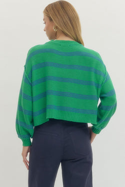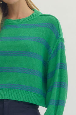 Snag this playful striped knit sweater with long sleeves—the perfect green companion for cozy vibes and effortless style.