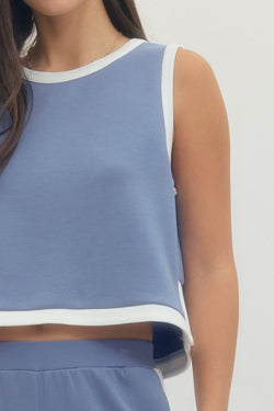 Sleek sleeveless knit top with chic contrast binding and a hidden button closure at the back. Pair it with wide-leg pants for an effortlessly put-together vibe that's ready for anything.