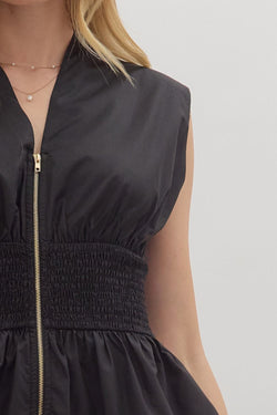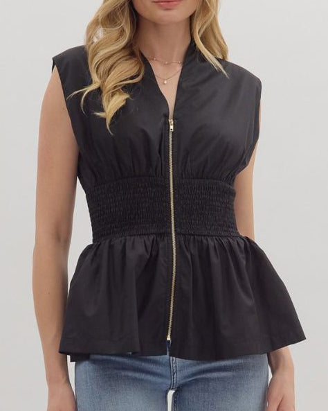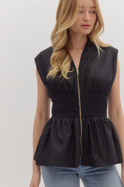 This black sleeveless top combines style and comfort with its wide smocked waist and flattering peplum hem, highlighting your natural silhouette. The front zipper closure adds a modern touch and easy wearability, making it a perfect fall essential to elevate your wardrobe effortlessly.
