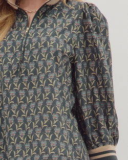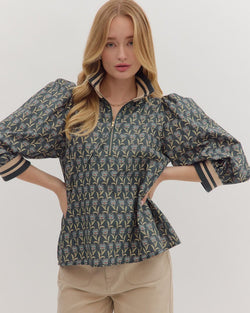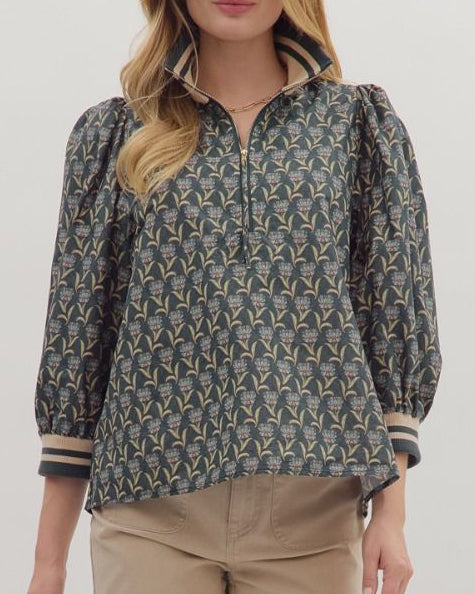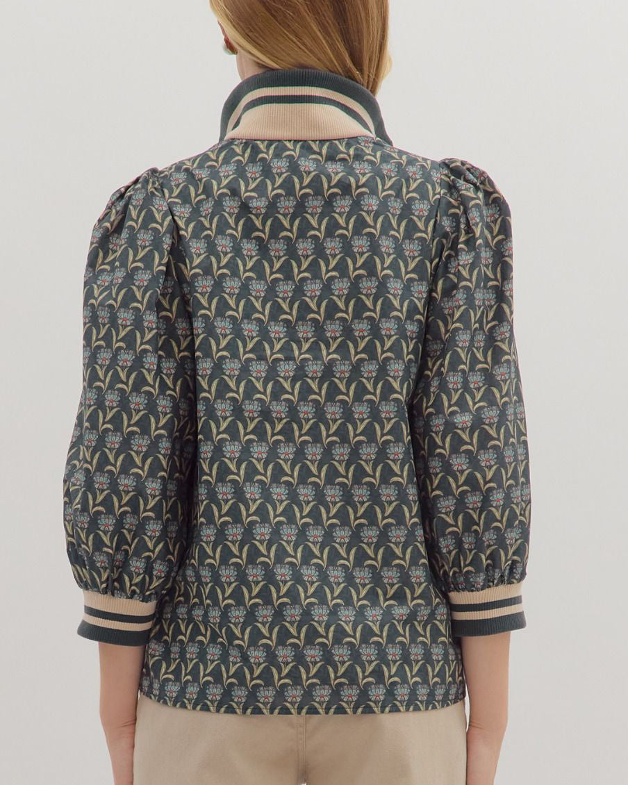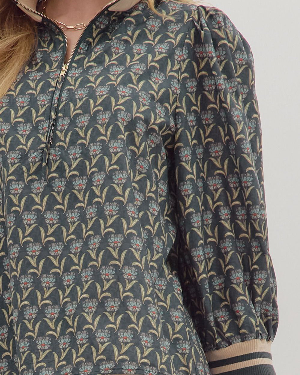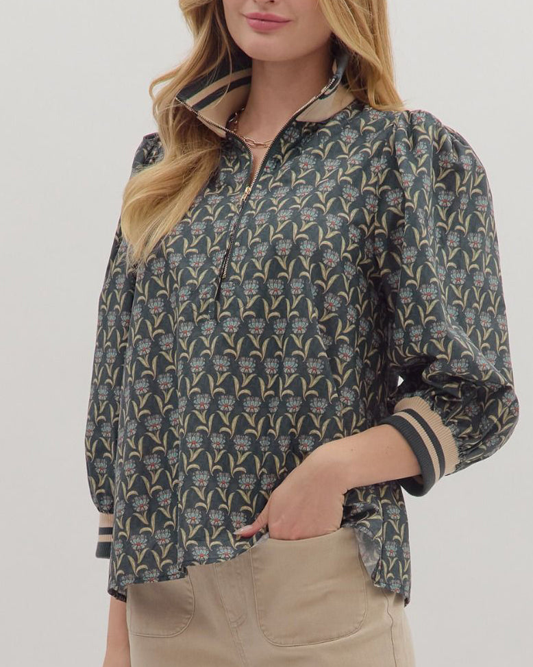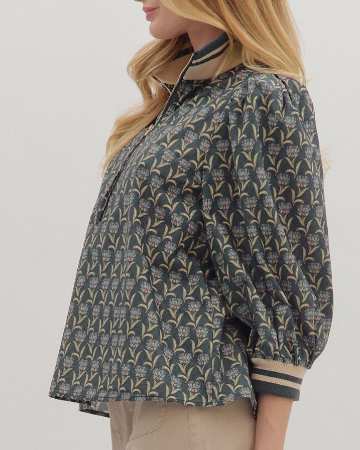 Bring a pop of fun to your wardrobe with this floral print top, featuring charming 3/4 puff sleeves and a half zip front for easy style swaps. The contrast stripe ribbed collar and cuffs add a cheeky twist to your everyday look!