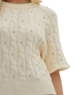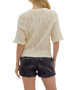 This cream short sleeve sweater top mixes cozy cable knit with fun pearl accents for a playful pop of style. Lightweight yet warm, it’s perfect for adding sparkle to your everyday look.