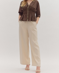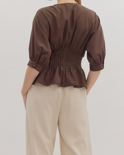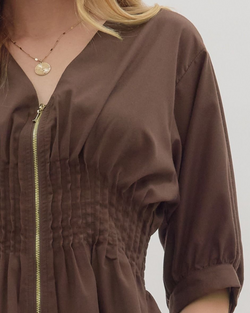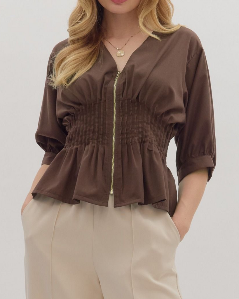 This brown zip-up top brings fun to your wardrobe with a ruched waist that flares out playfully. The 3/4 sleeves add a flirty finish to this effortlessly cool style.