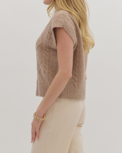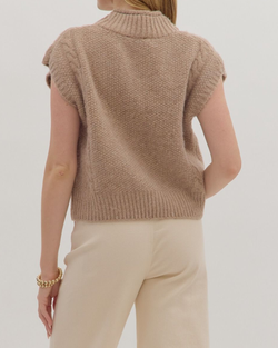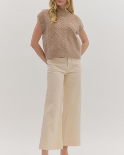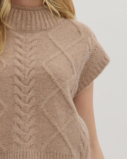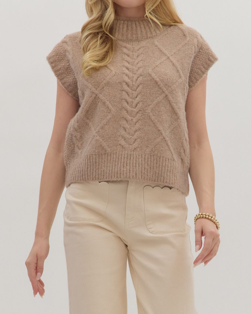 Stay cozy and chic in this oatmeal mock neck sweater, featuring a charming cable knit pattern that adds playful texture.