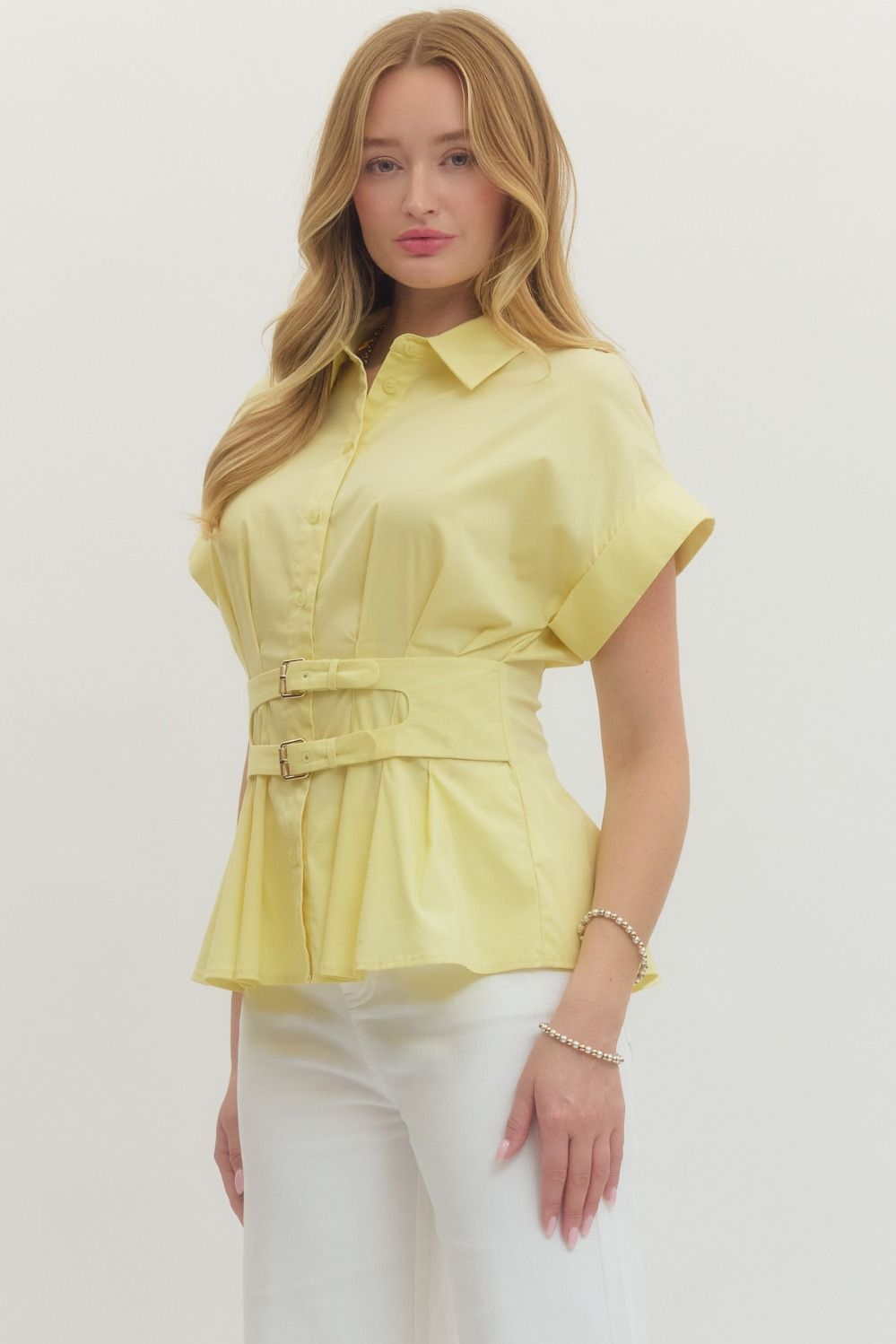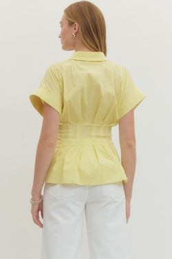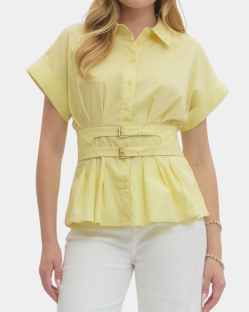 This refined button-down top, features crisp short cuff sleeves and a defined belted waist. The cheerful yellow hue brings warmth and sophistication to any ensemble, while the structured silhouette flatters and polishes your look.