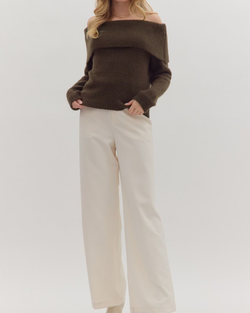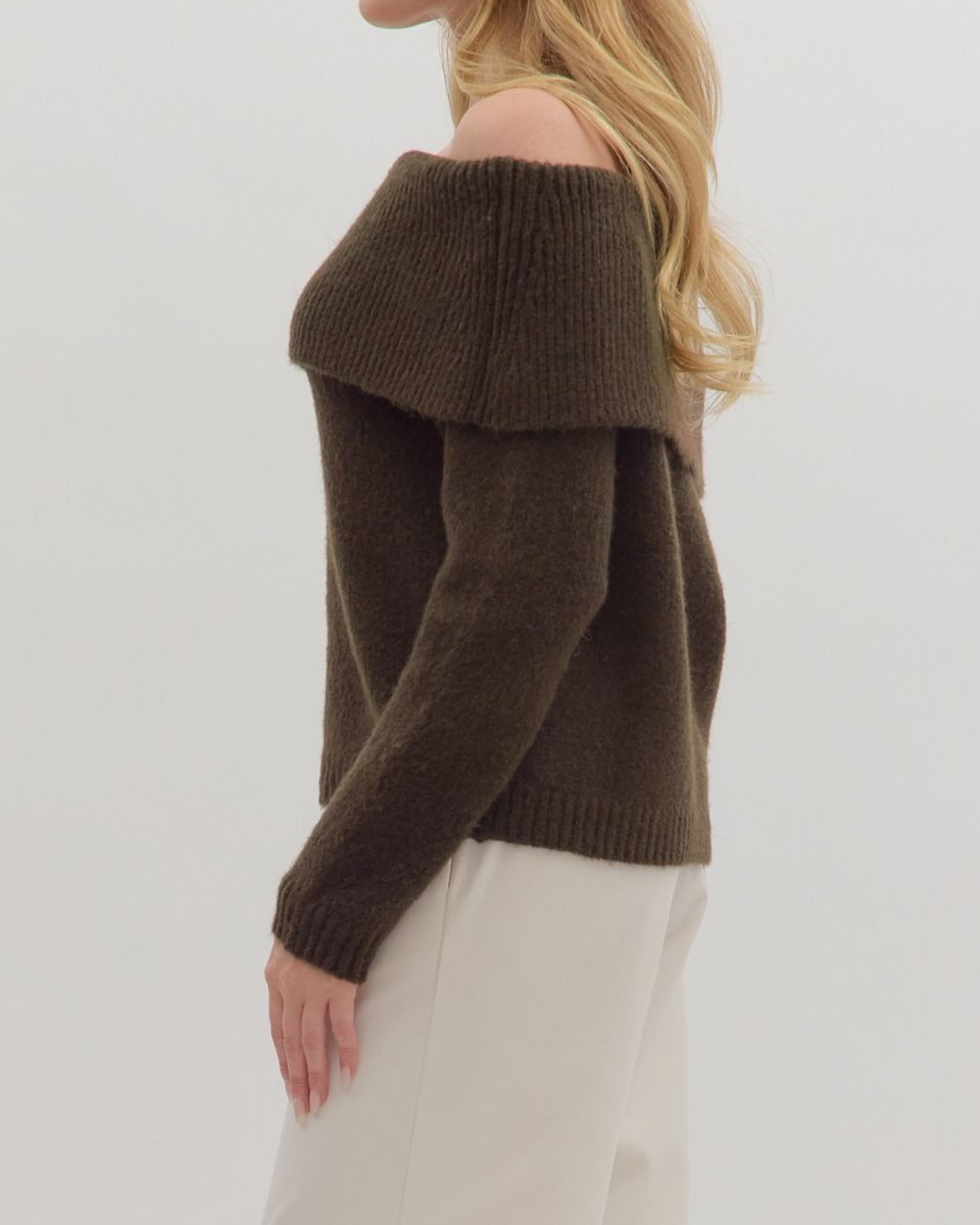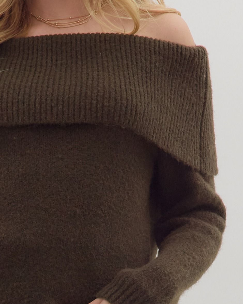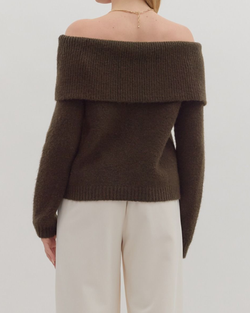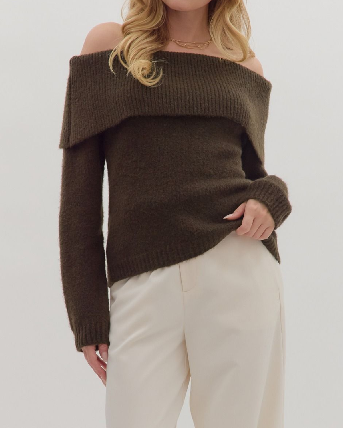 This brown off-the-shoulder knit top combines cozy sophistication with a playful twist, featuring a flattering foldover ribbed neckline.