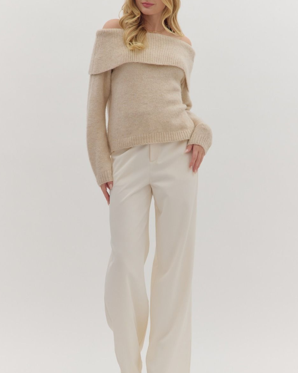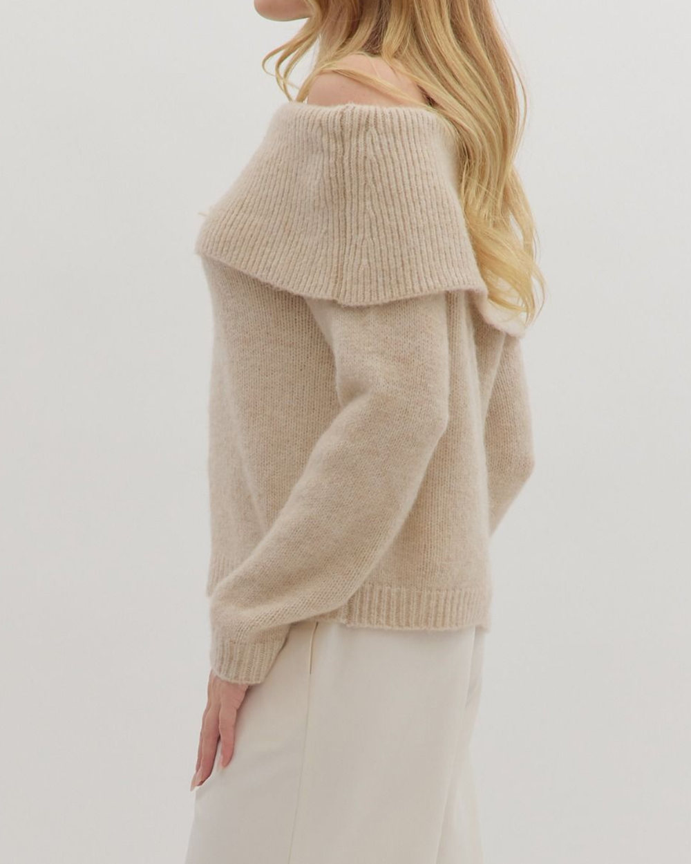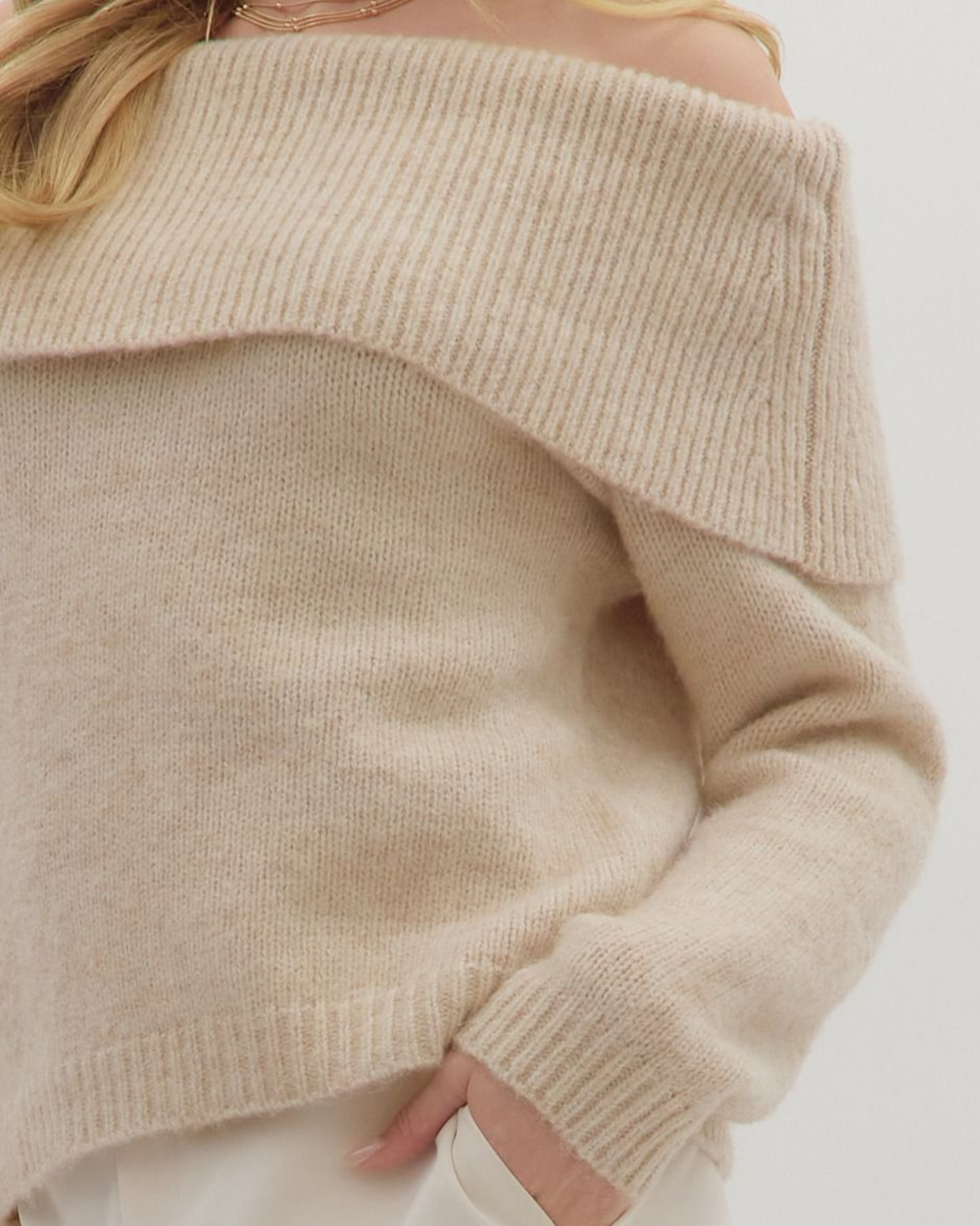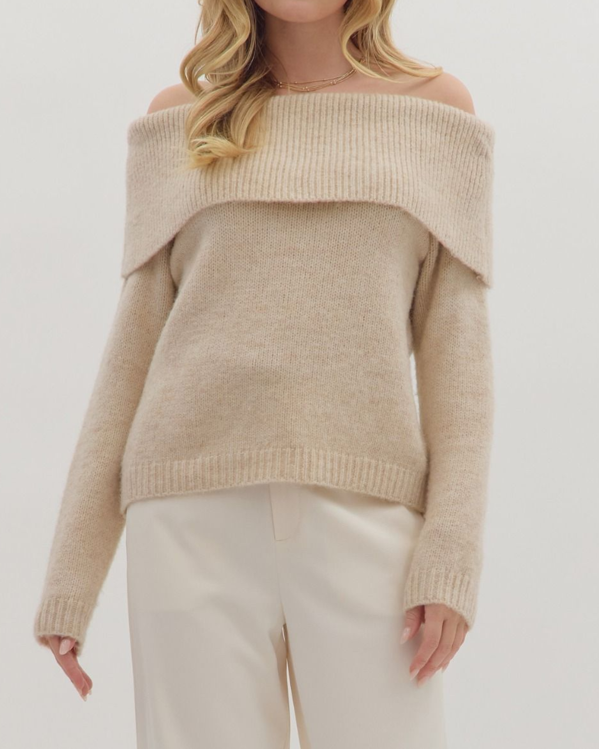 This brown off-the-shoulder knit top combines cozy sophistication with a playful twist, featuring a flattering foldover ribbed neckline.