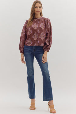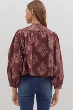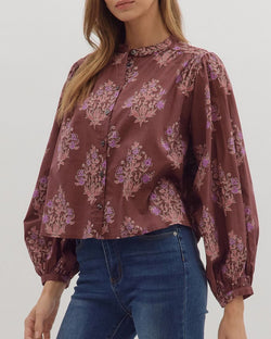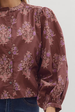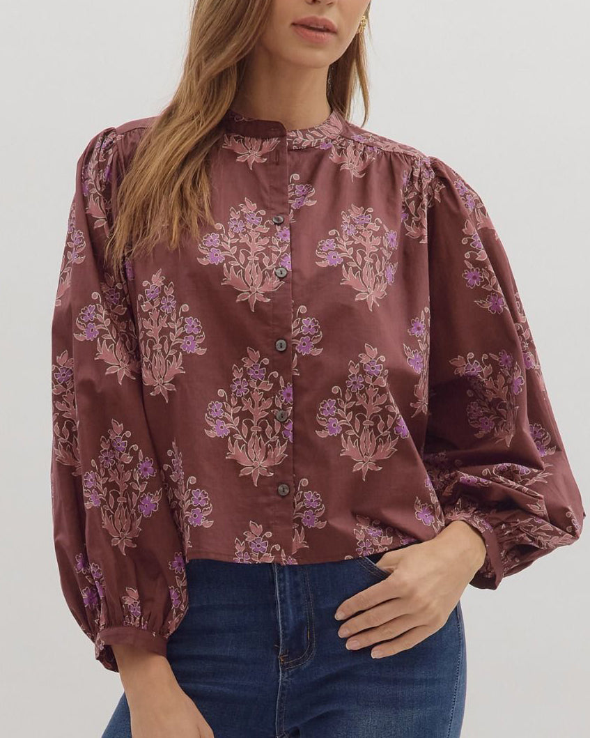 Elevate your wardrobe with this sophisticated burgundy floral print button-down top. Crafted for effortless elegance, it features a delicate floral pattern that adds subtle charm, while the tailored fit enhances your silhouette. Perfect for both professional settings and refined casual occasions, this top offers a timeless look that pairs beautifully with tailored pants or skirts.