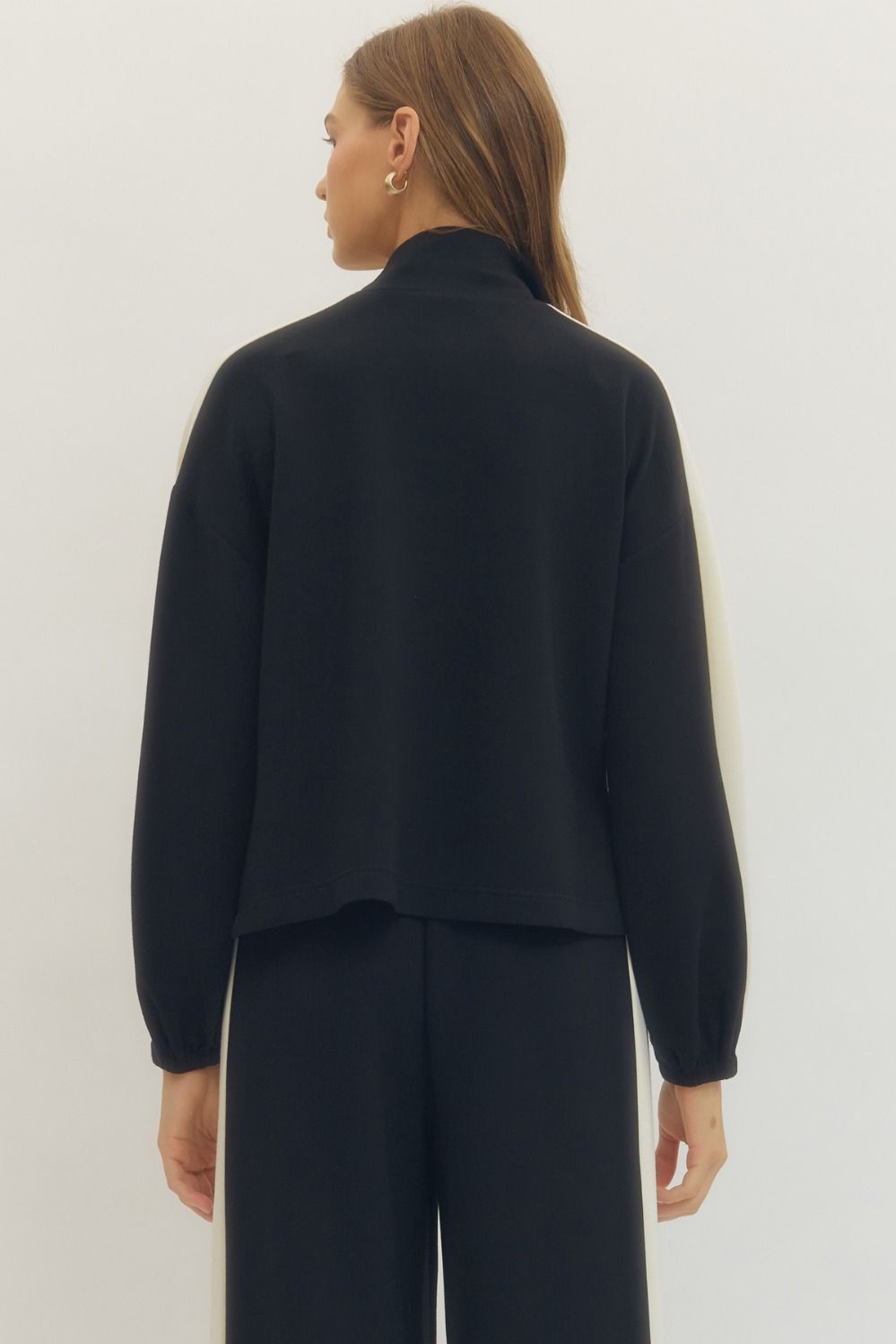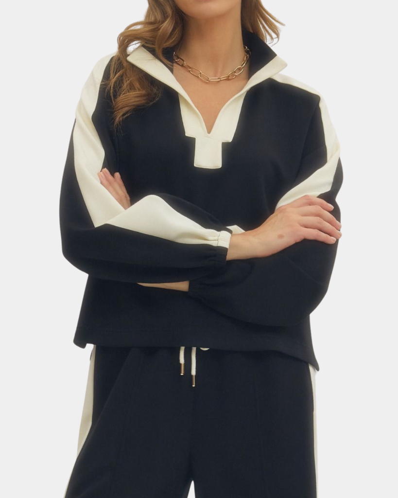 Rock this knit top with a solid, contrasted collar and striped sleeves for a groovy and chic lounging outfit. Match it with wide leg pants to complete the look!