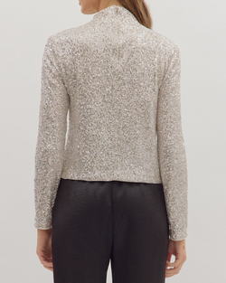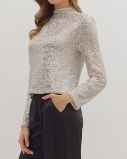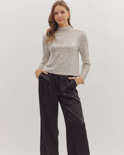 Elevate your wardrobe with this refined solid long sleeve knit top, featuring a chic mock neck and shimmering sequin embellishments throughout. Perfect for adding a touch of understated glamour to any ensemble.