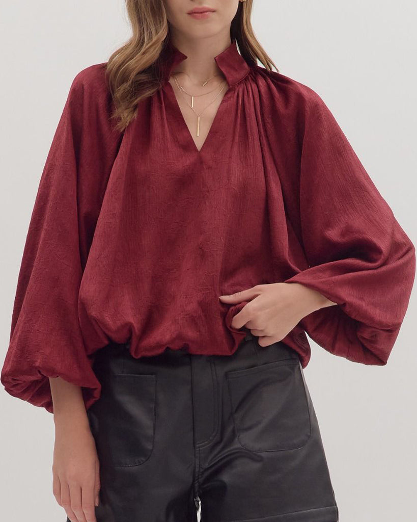 This burgundy V-neck top combines elegance and subtle drama with its solid balloon sleeves and delicate pleated shoulder details. The gathered back yoke enhances its refined silhouette, offering a sophisticated look perfect for both professional settings and stylish everyday wear.