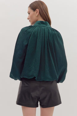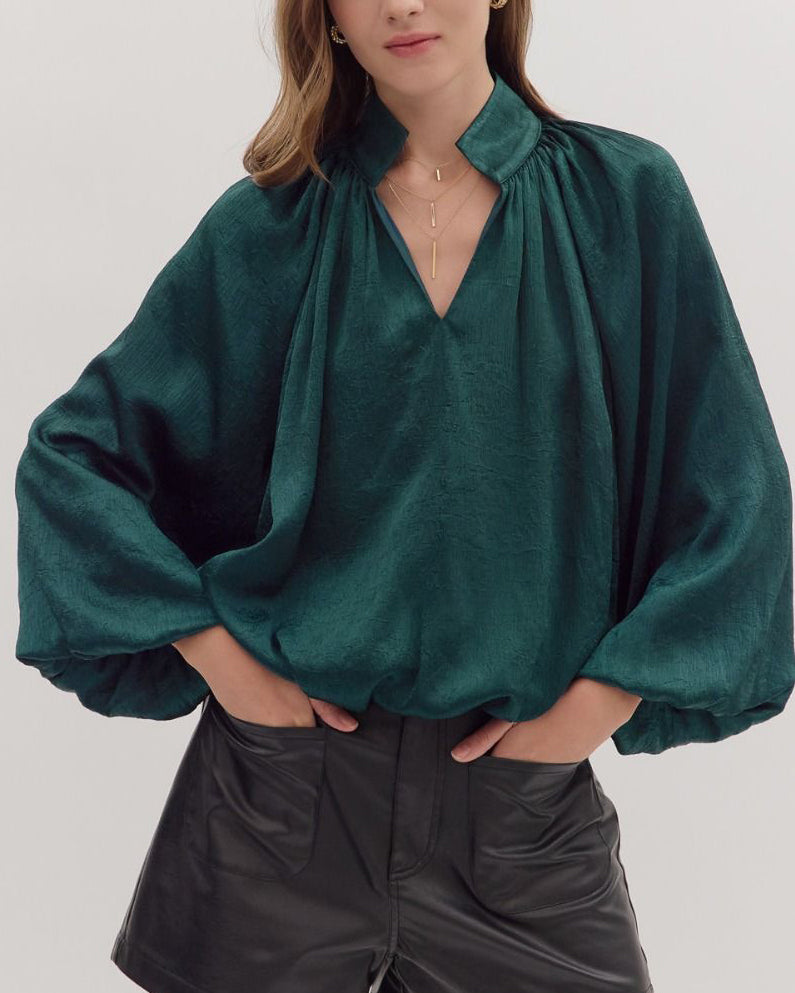 This hunter green V-neck top combines elegance and subtle drama with its solid balloon sleeves and delicate pleated shoulder details. The gathered back yoke enhances its refined silhouette, offering a sophisticated look perfect for both professional settings and stylish everyday wear.
