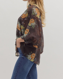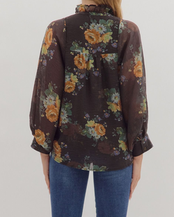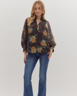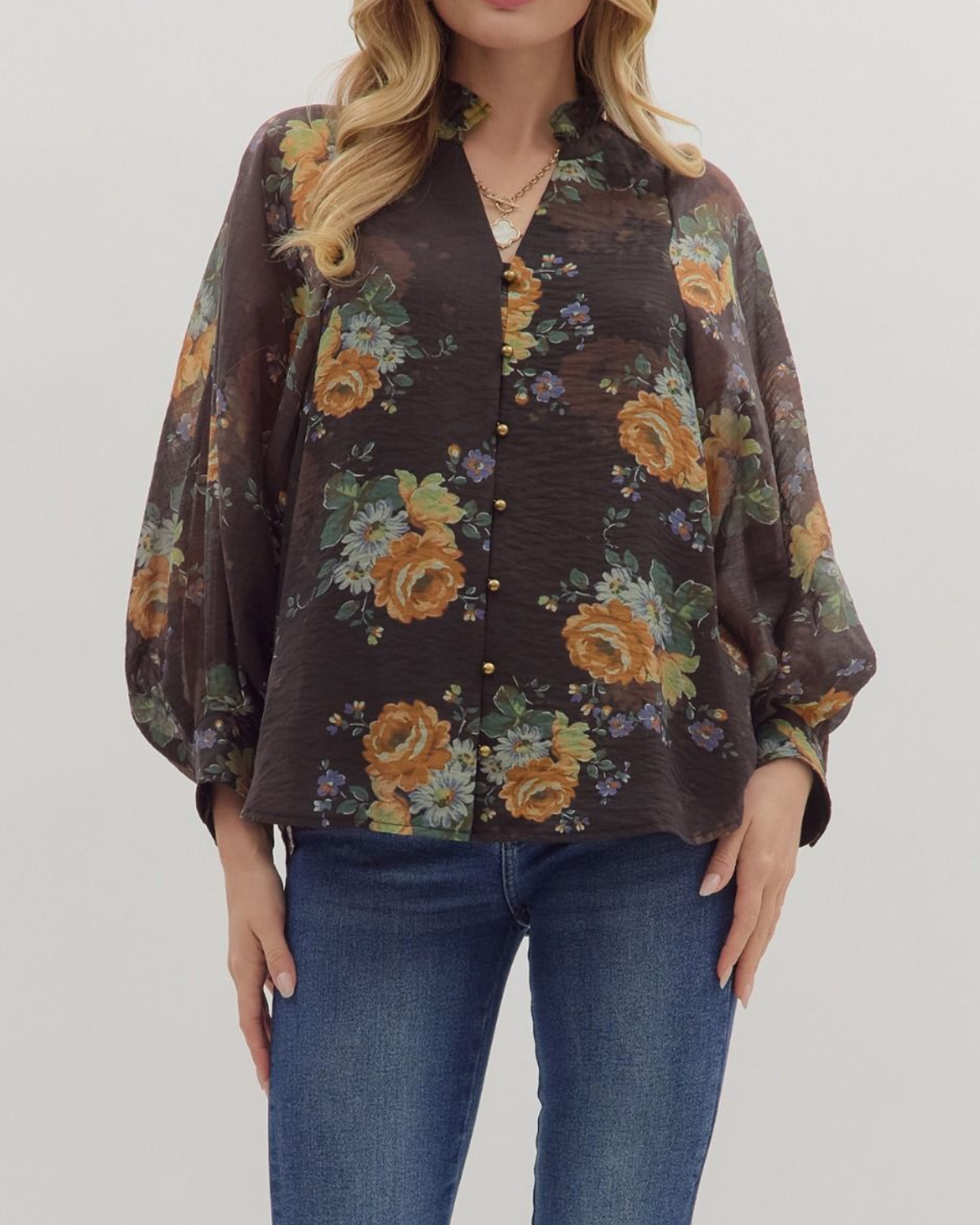 This charming floral print top dazzles with long puff sleeves and a flirty ruffled band collar. The V-neck adds a touch of elegance, making it perfect for twirling into any sunny day!