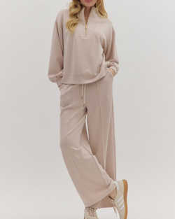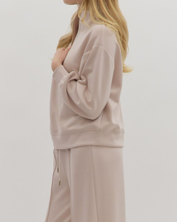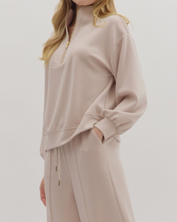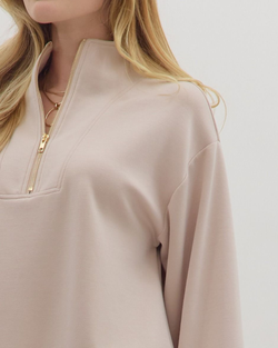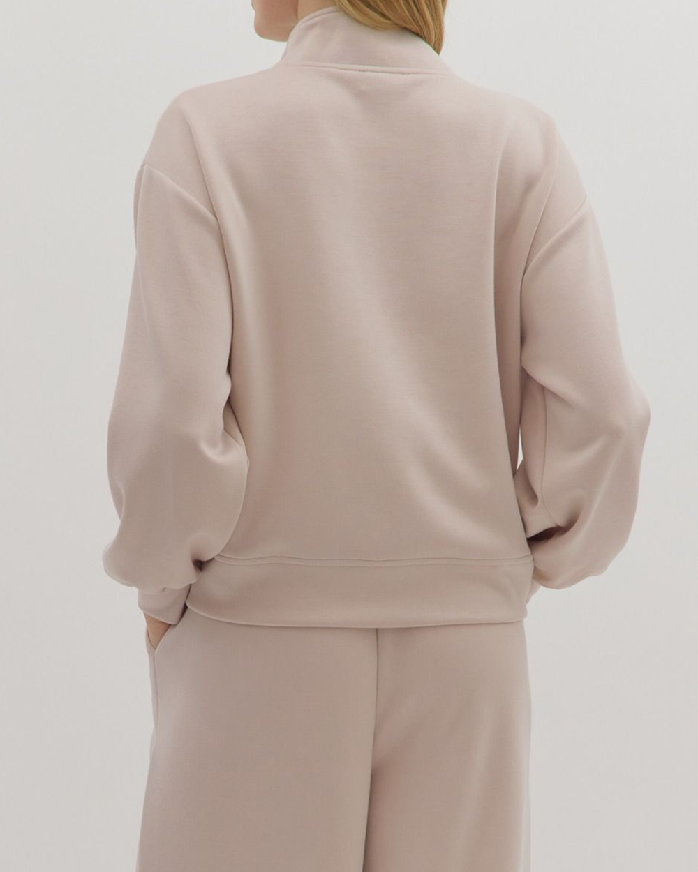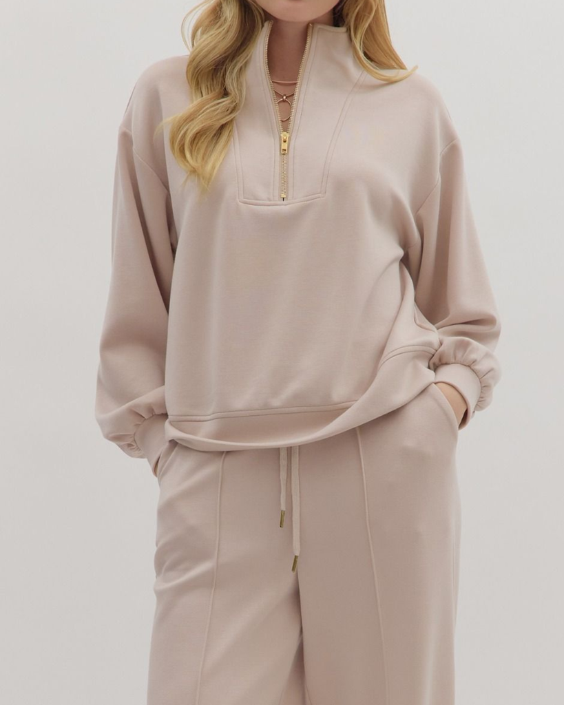 Cozy up in this almond-hued stand collar sweater that’s as charming as it is comfy. The half zip lets you play peekaboo with your look while keeping the chill at bay!