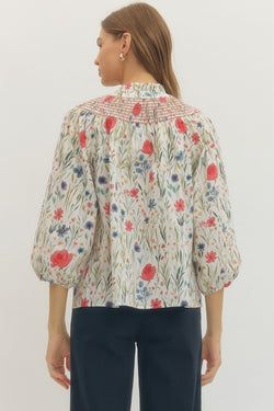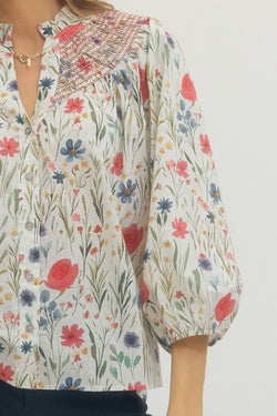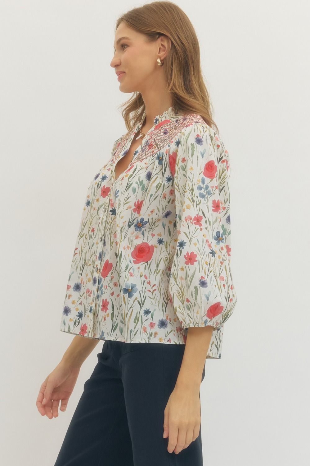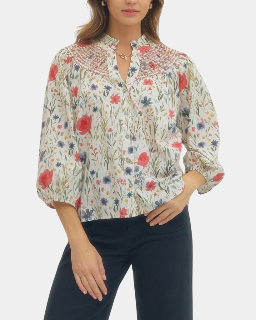 This floral beauty rocks a playful smocked yoke that adds dimension and charm. The three-quarter sleeves hit just right, while the front button closure keeps things effortless.