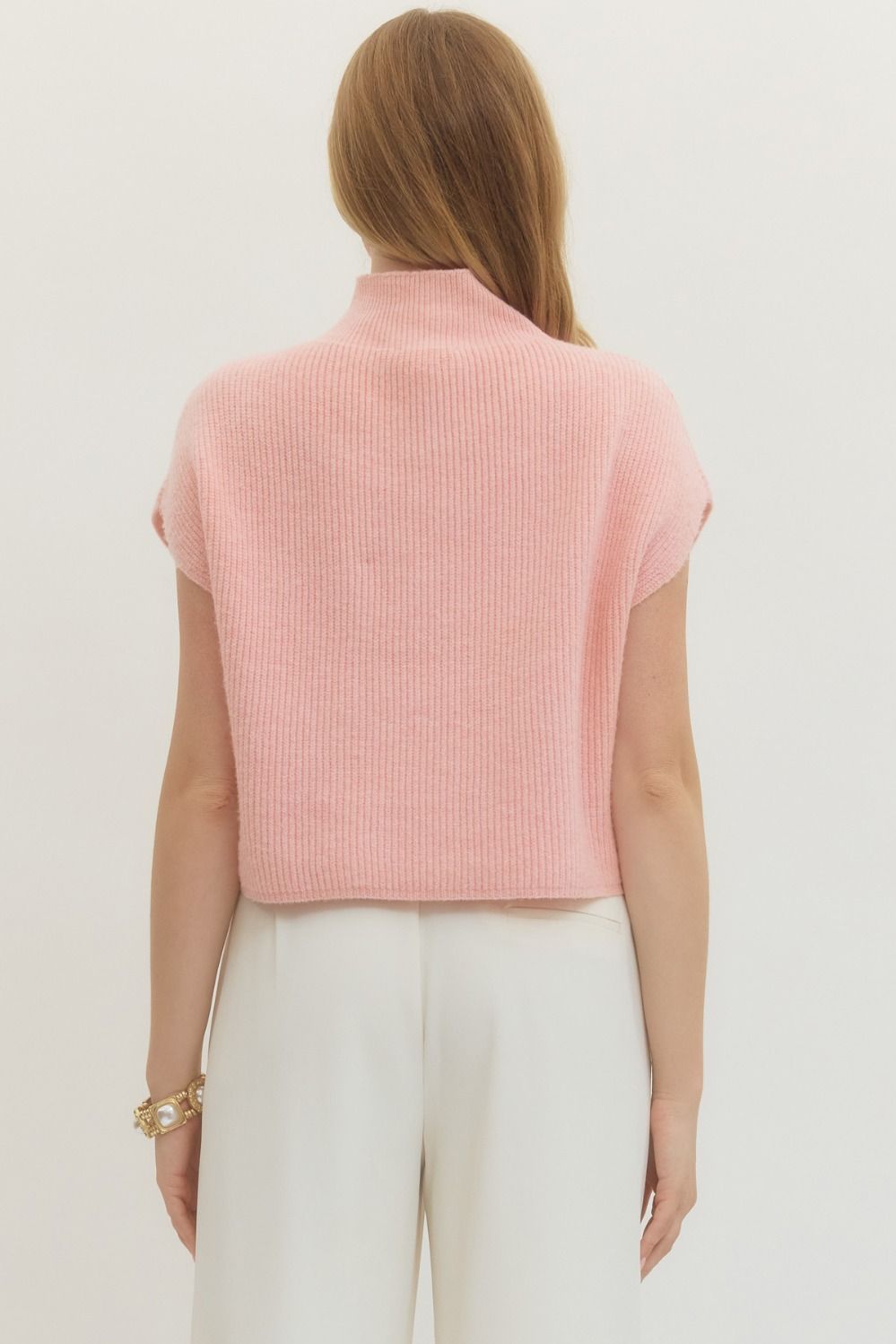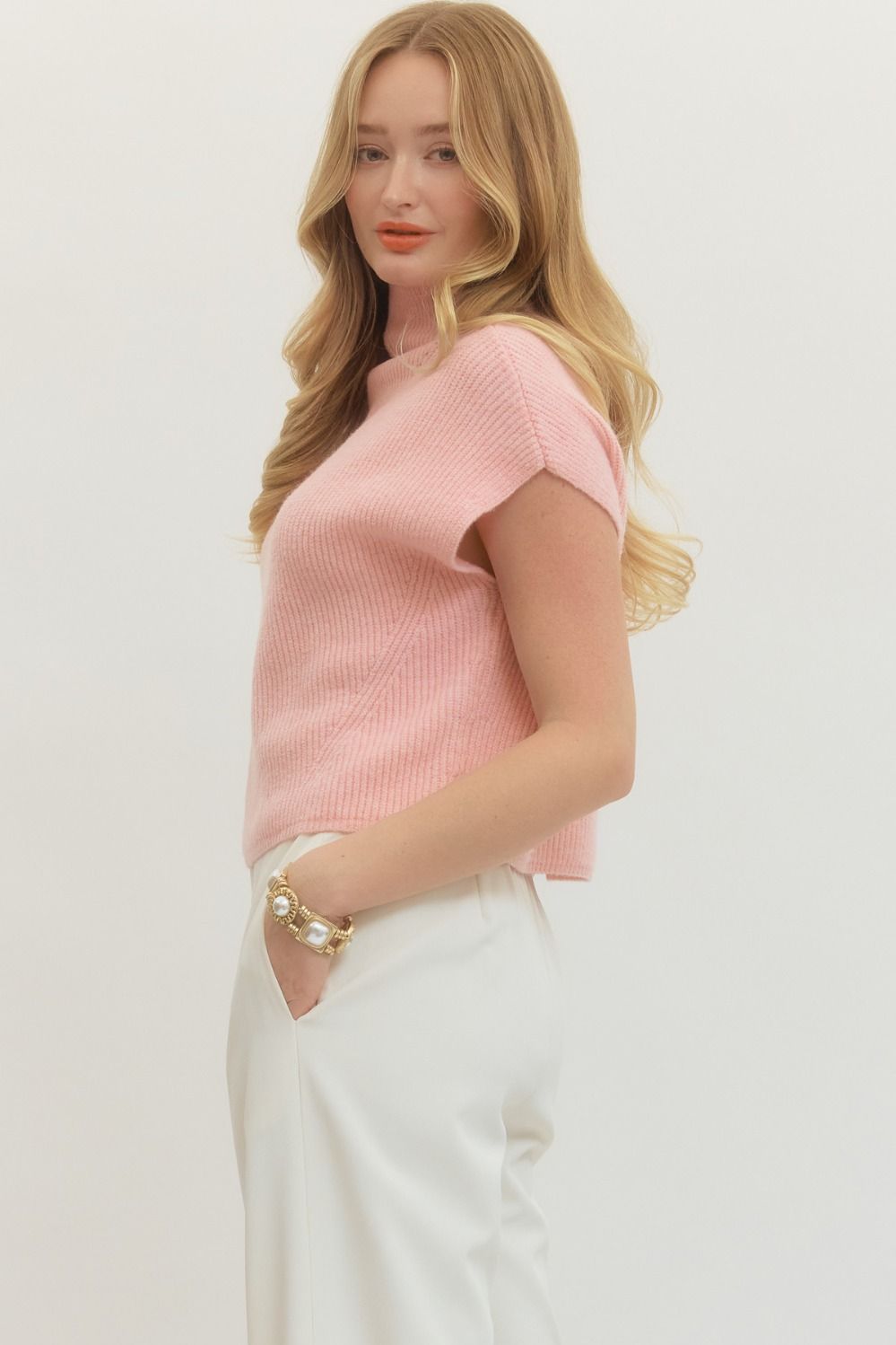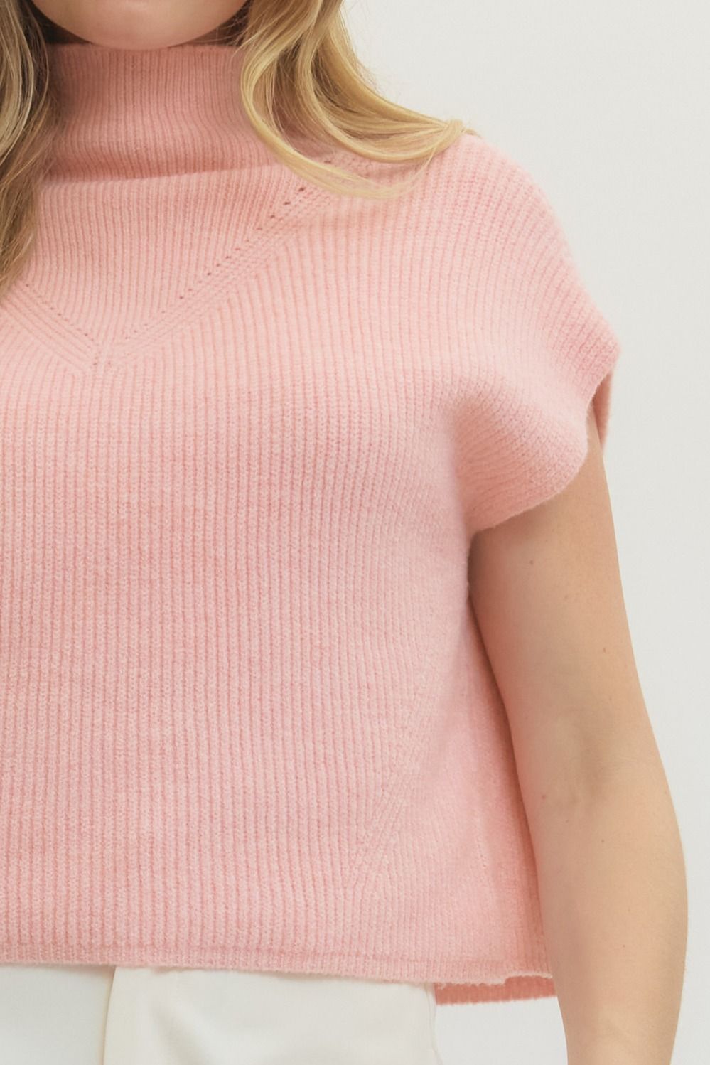 Cozy up in this adorable mock neck sweater top with a playful rib texture that adds dimension and visual interest. The cap sleeves keep things breezy while the fitted mock neck gives major chic vibes.