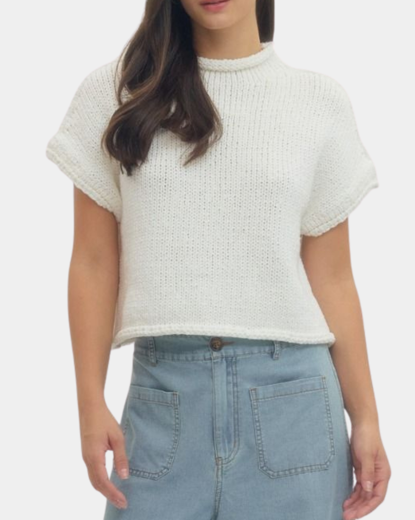 This solid knit top rocks a cozy rolled mock neck and matching rolled hem for that effortlessly vibe. Short sleeves make it perfect for transitional weather, while the timeless off-white shade pairs with literally everything in your closet.