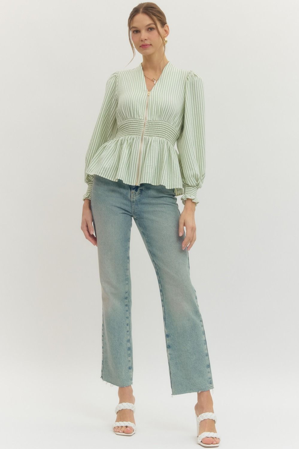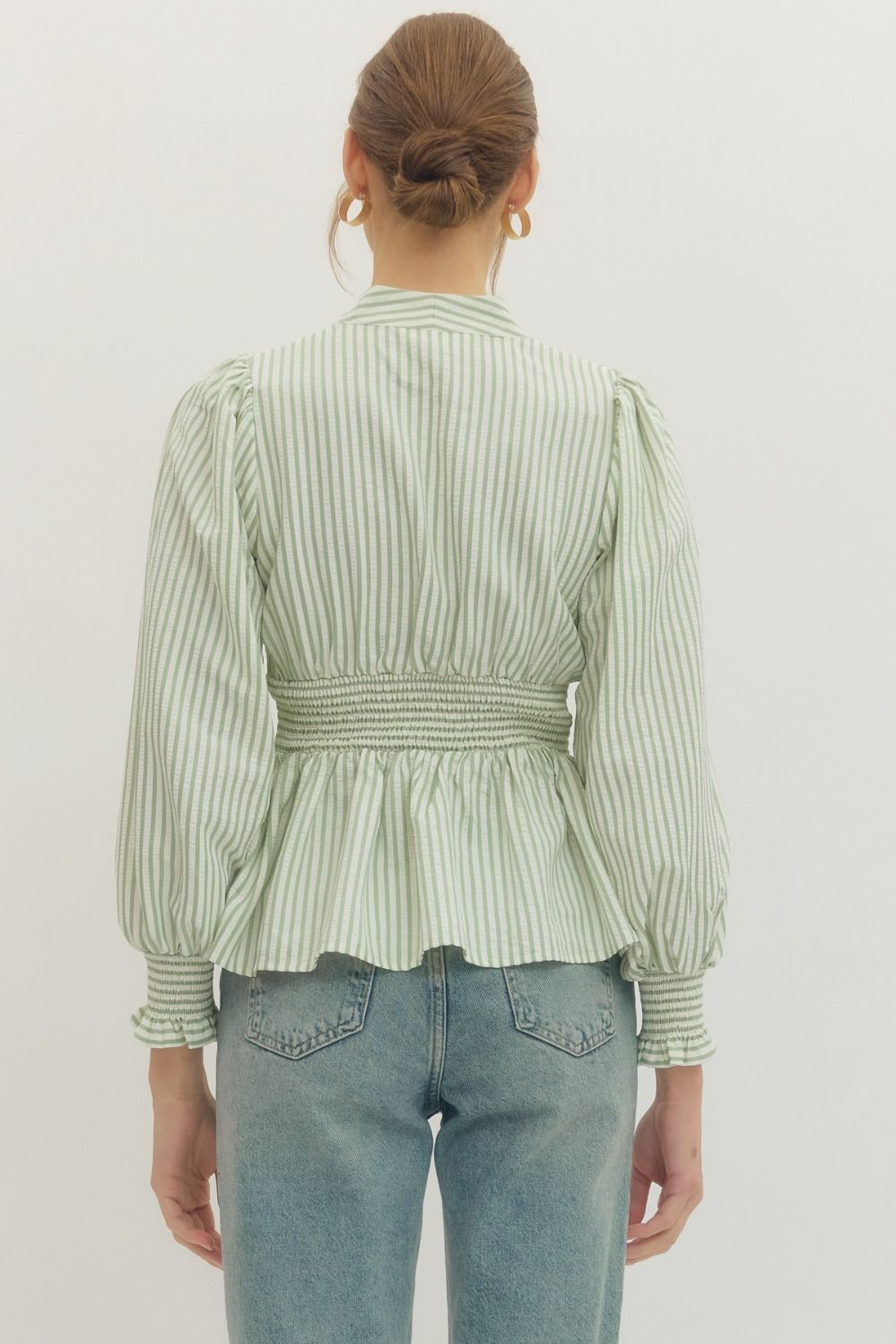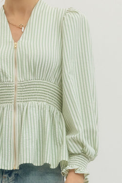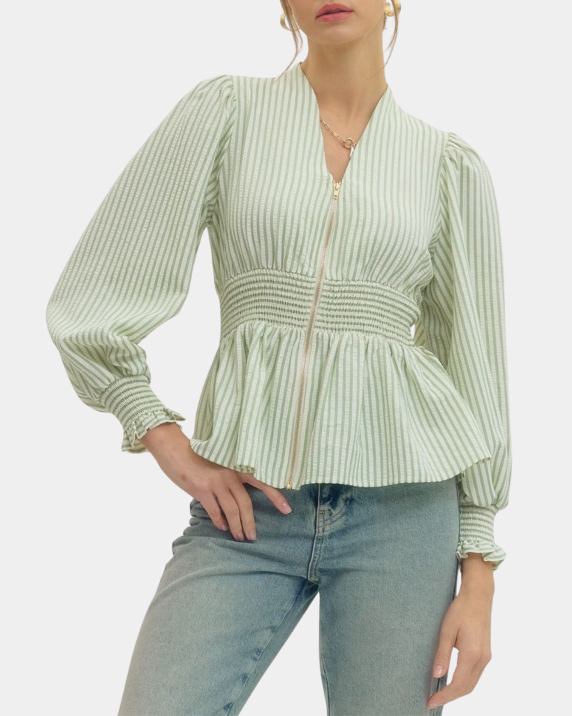 This striped peplum top adds a fun twist with its smocked waistband and flirty ruffle trim. The V-neck keeps it fresh and perfect for any playful outfit!