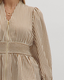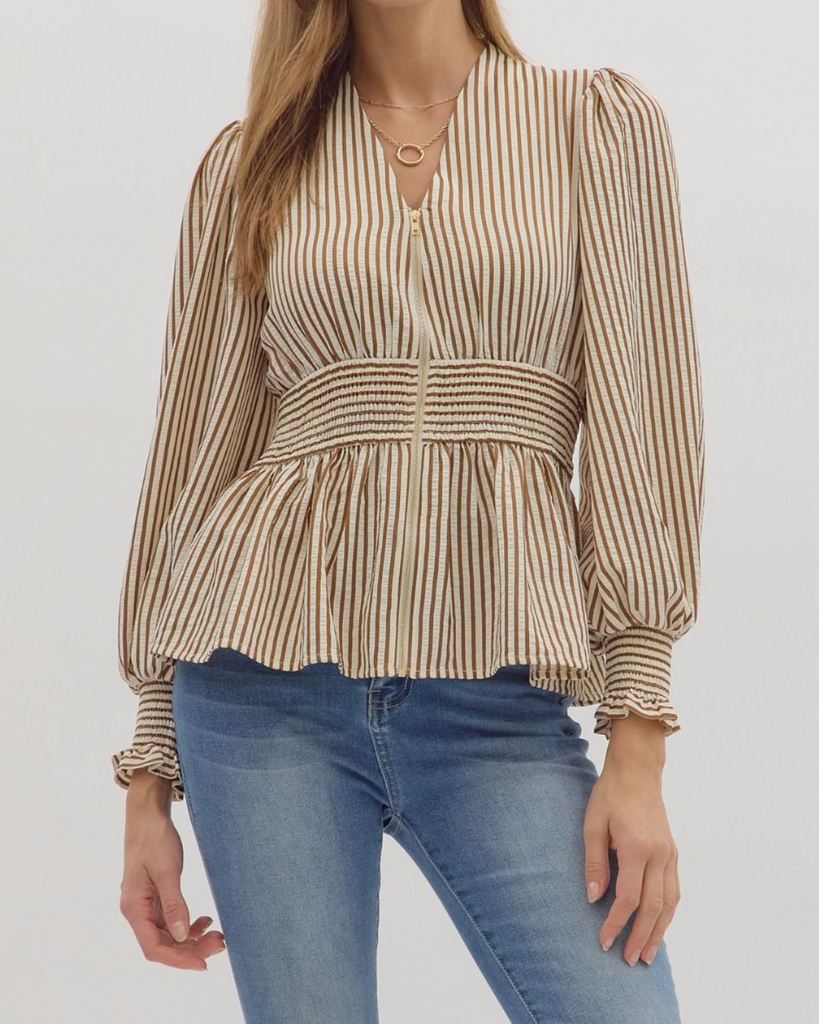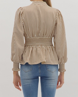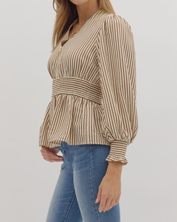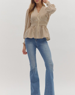 This striped peplum top in Carmel adds a fun twist with its smocked waistband and flirty ruffle trim. The V-neck keeps it fresh and perfect for any playful outfit!