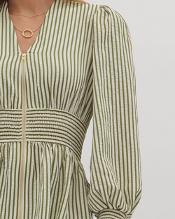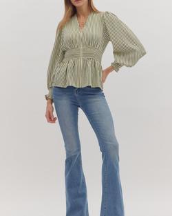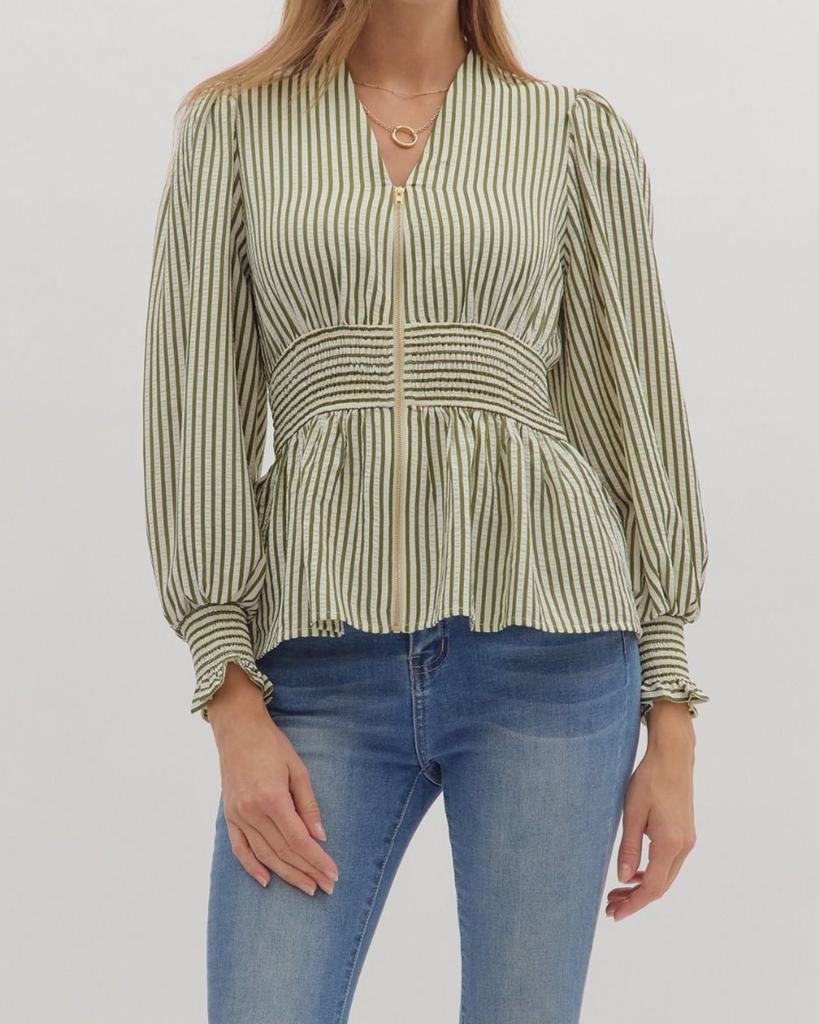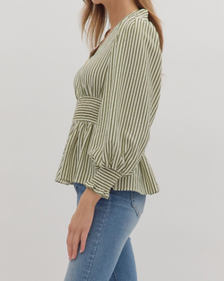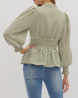 This striped peplum top adds a fun twist with its smocked waistband and flirty ruffle trim. The V-neck keeps it fresh and perfect for any playful outfit!