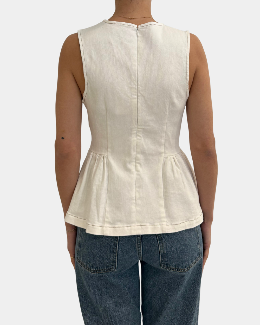 Playful and polished, this sleeveless peplum top in ecru denim features striking contrast topstitching and a convenient back zipper. Easy to slip on, impossible to ignore.