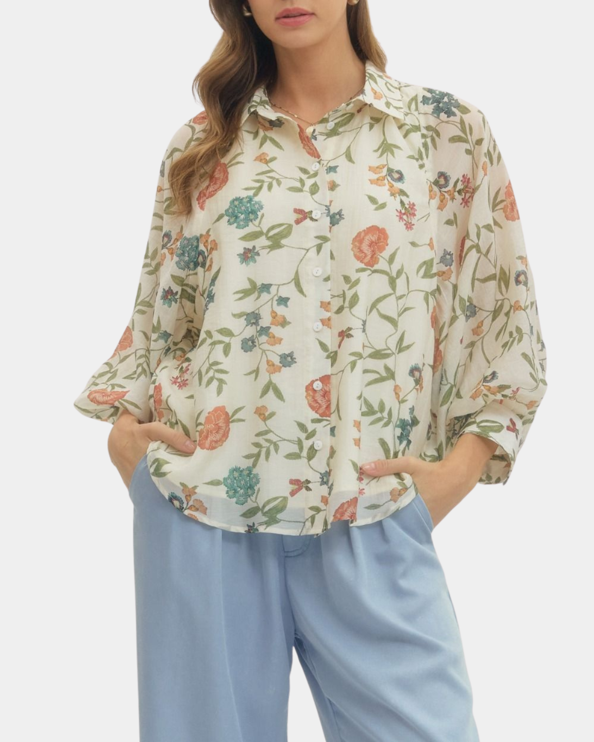 This classic shirt collar with a front button closure delivers timeless sophistication, while the delicate botanical pattern adds understated elegance to any ensemble.