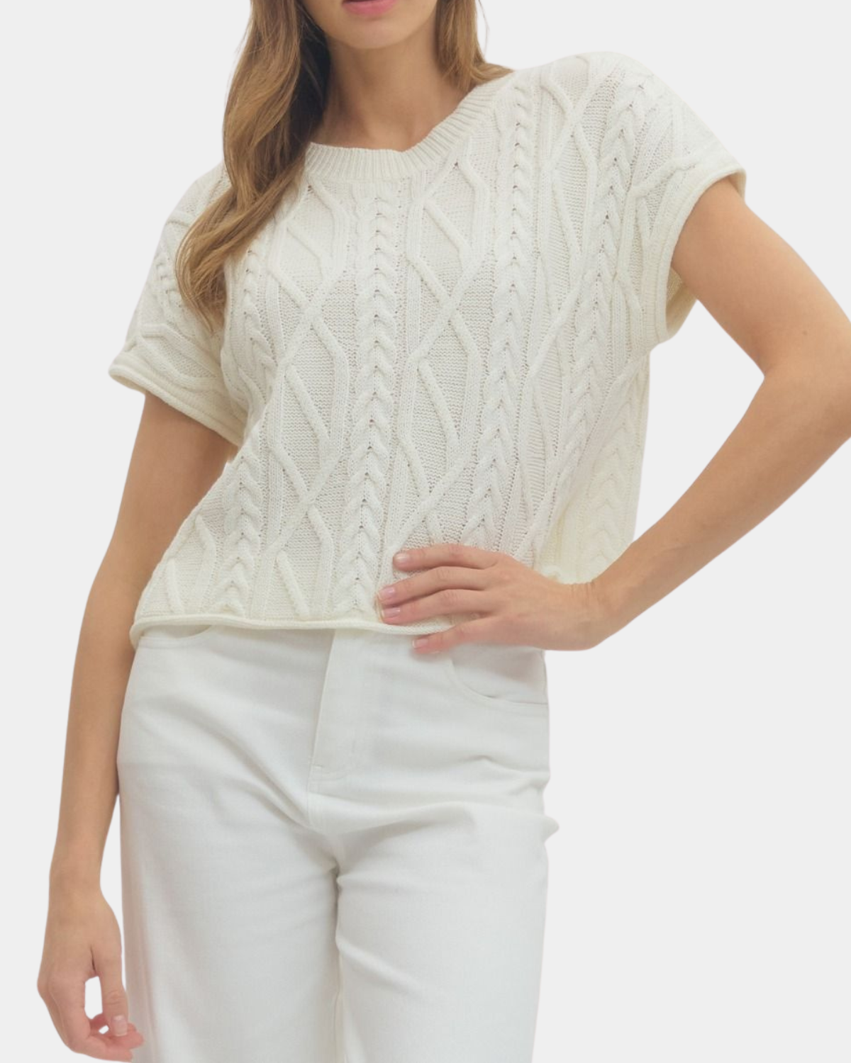 Elevate your everyday wardrobe with this refined cable knit top in crisp off-white. The textured knit construction pairs beautifully with ribbed trims at the neckline, sleeves, and hem for a polished silhouette.