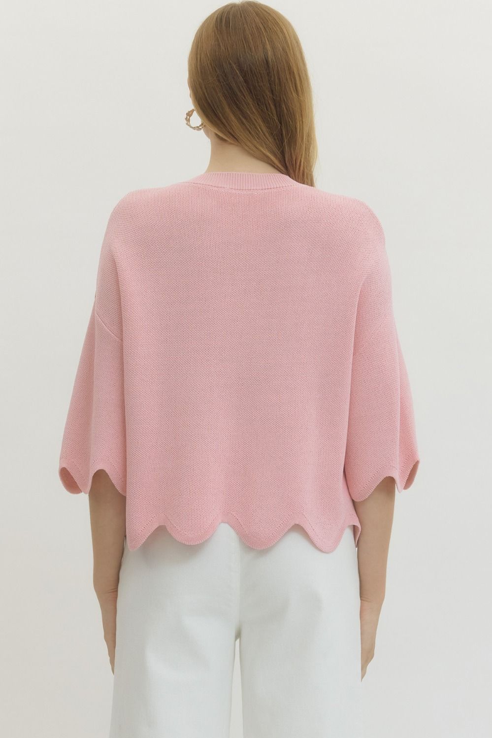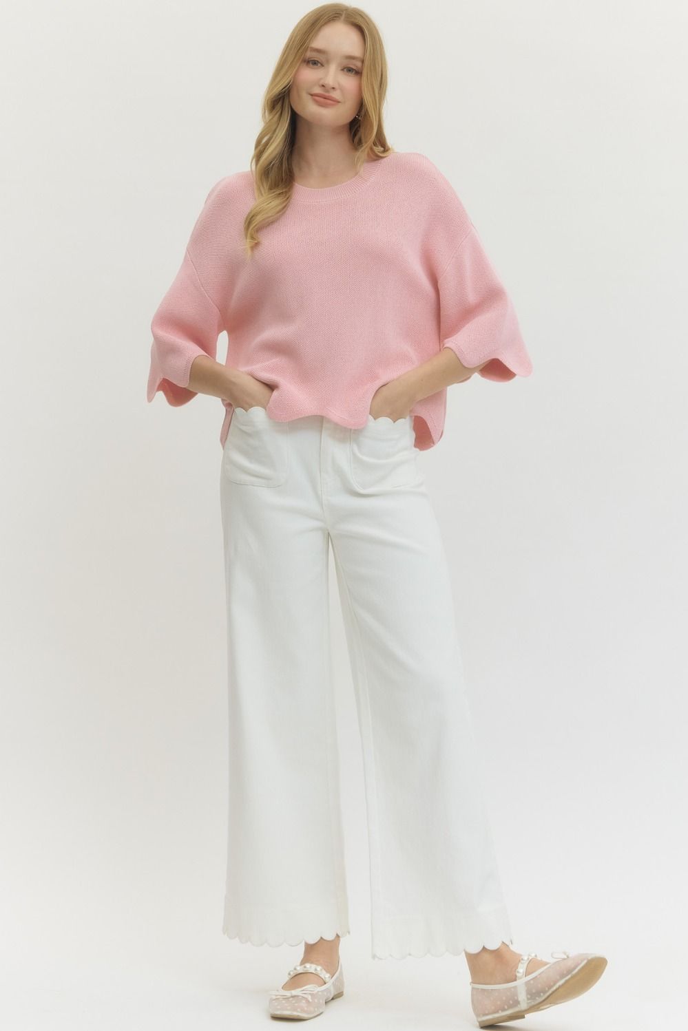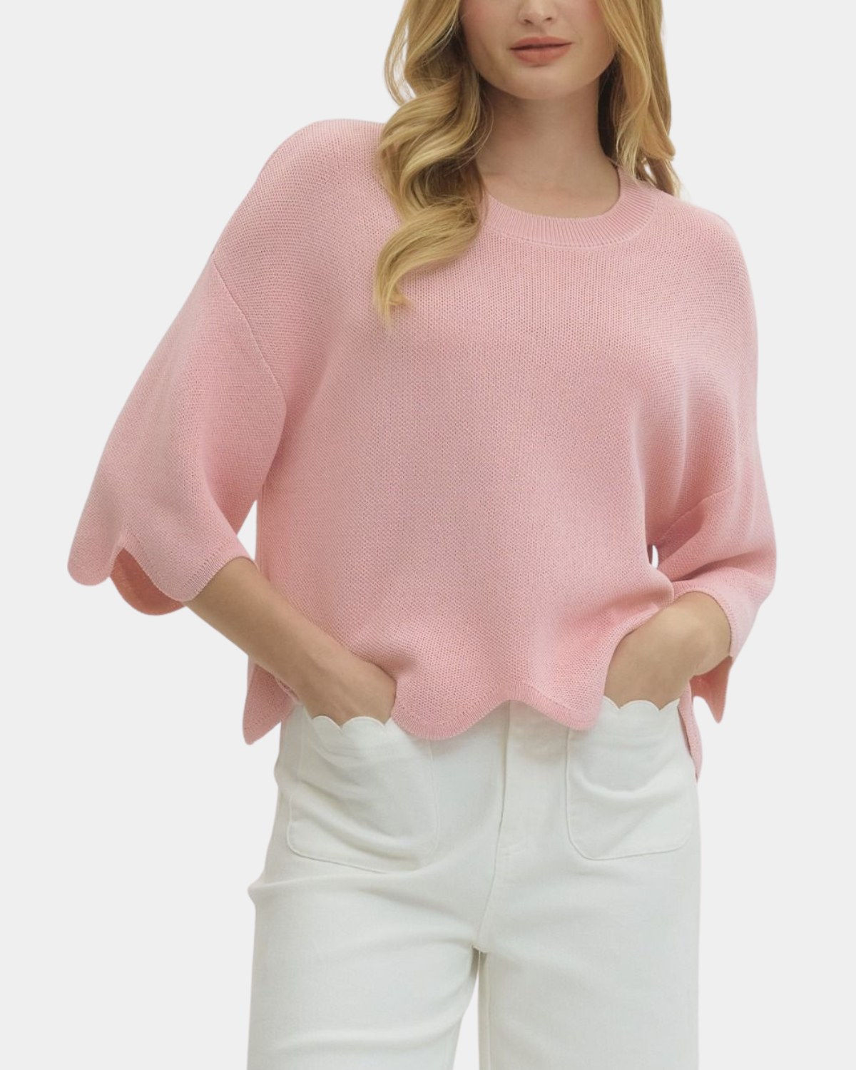Effortlessly elegant, this solid knit dolman top showcases graceful 3/4 sleeves and a delicate scallop hem for refined detail.