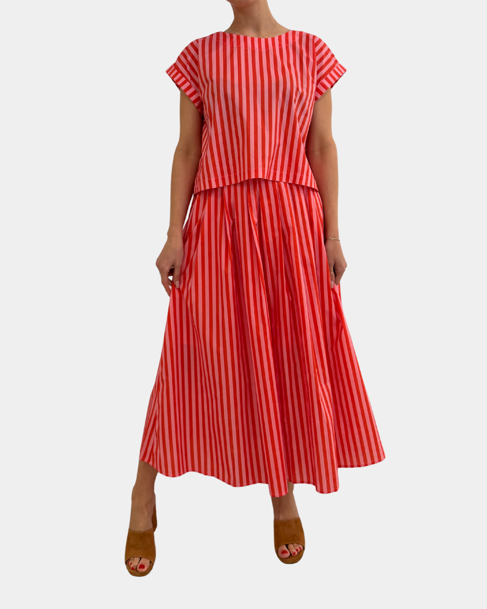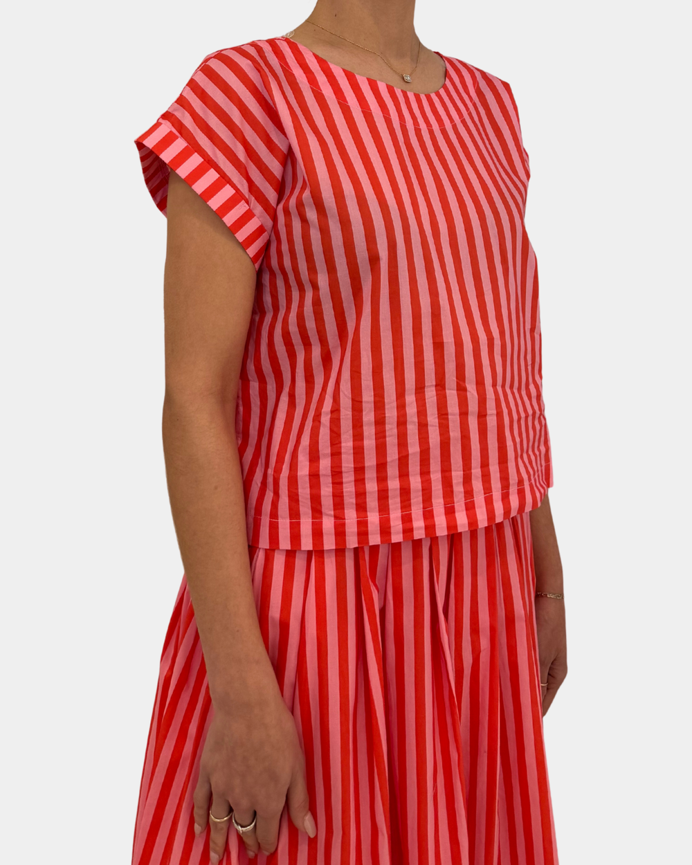 Rock this vibrant striped top in cheerful orange and pink hues—perfect for mixing with our matching skirt for an effortlessly coordinated look.