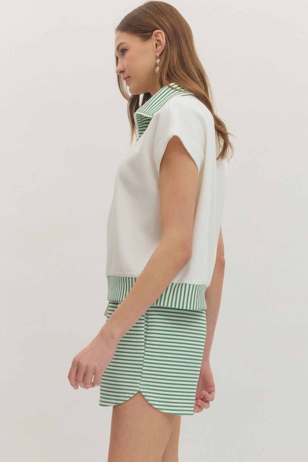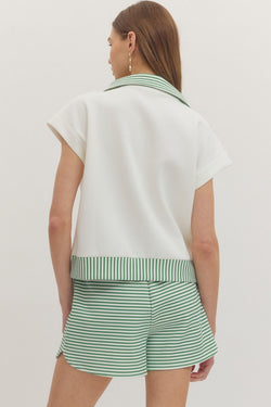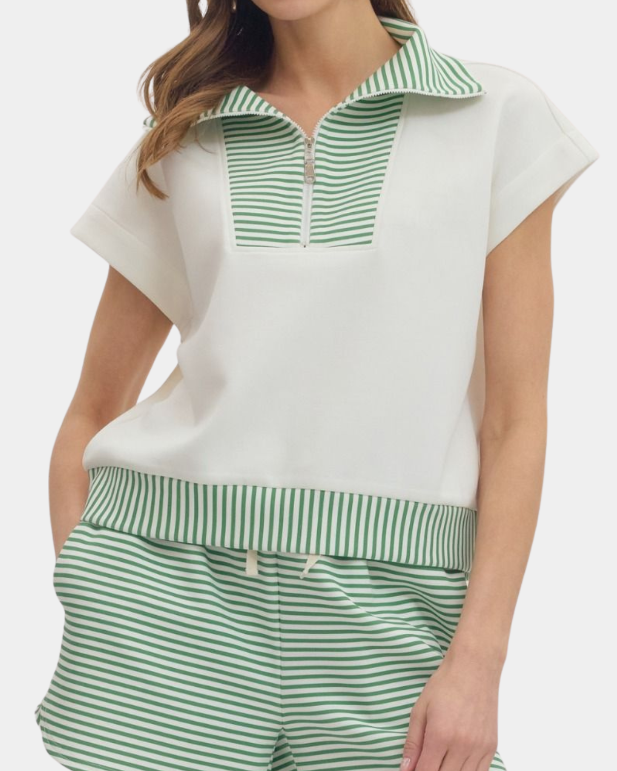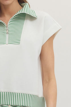 Playful stripes meet practical style in this charming half-zip knit top. The spread collar and ribbed trim add polish, while the front zip placket keeps things fun and functional.