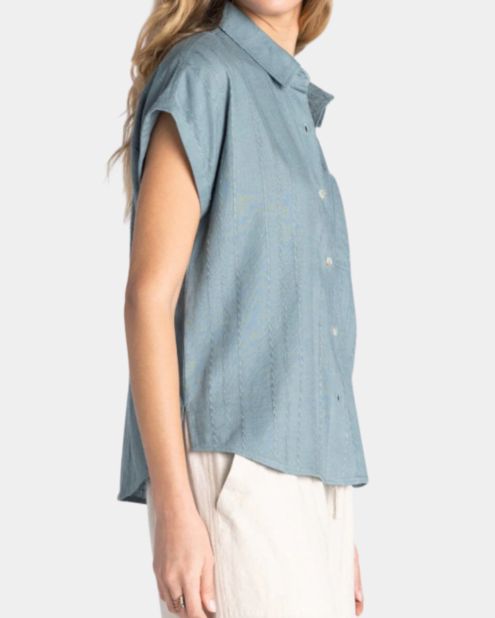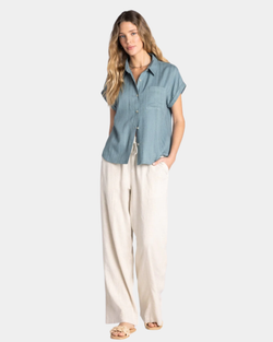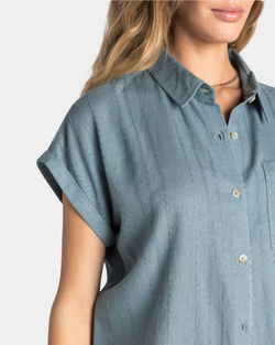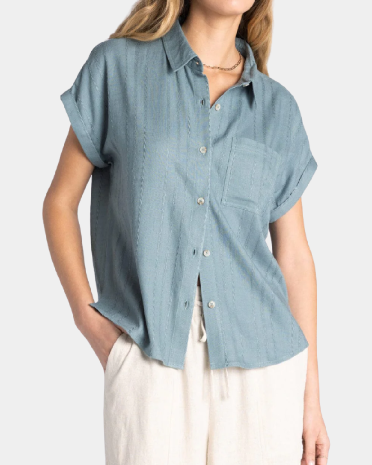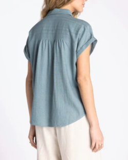 Breezy linen blend button-down that plays well with everything. Soft printed fabric, button front, and cuffed short sleeves make it the perfect warm-weather staple.