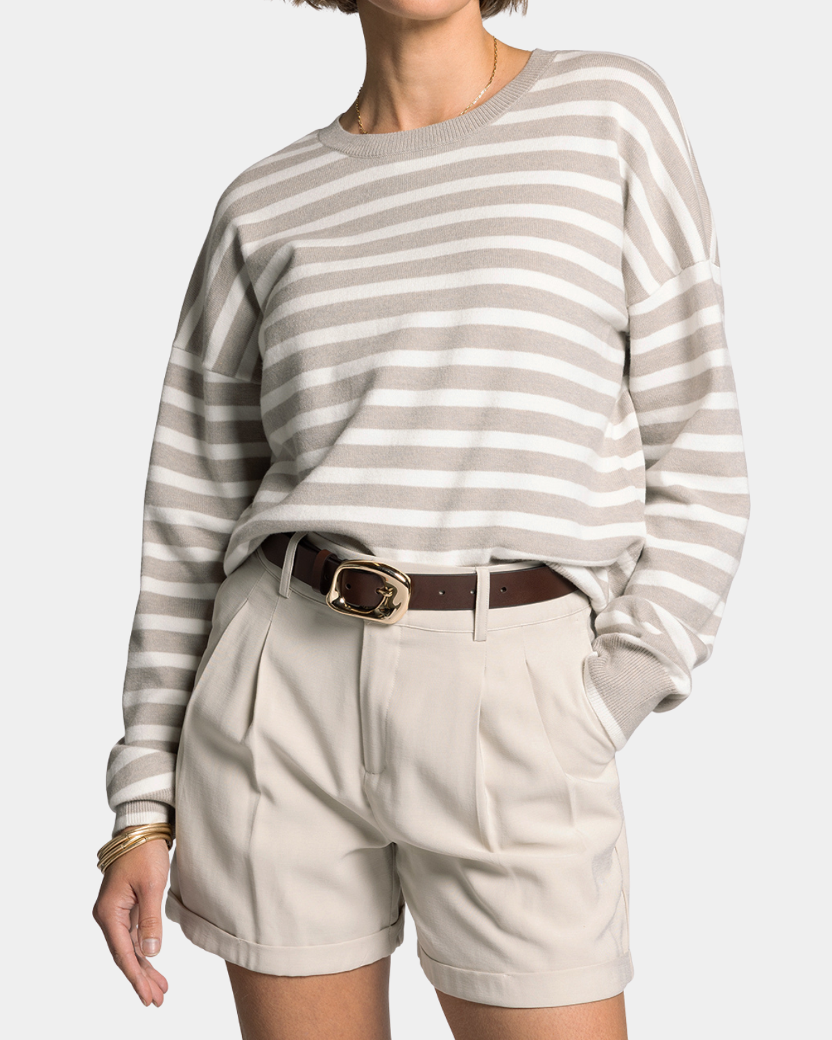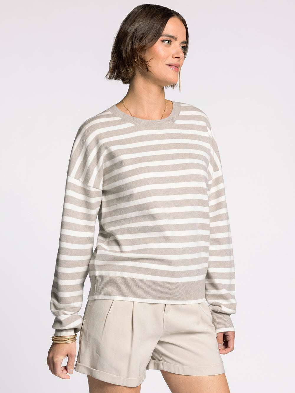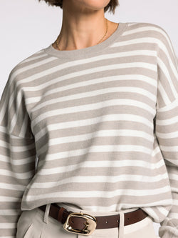 This Preston Sweater flaunts timeless ivory and taupe stripes that play beautifully together. Soft, versatile, and ready for anything—from coffee dates to cozy nights in.